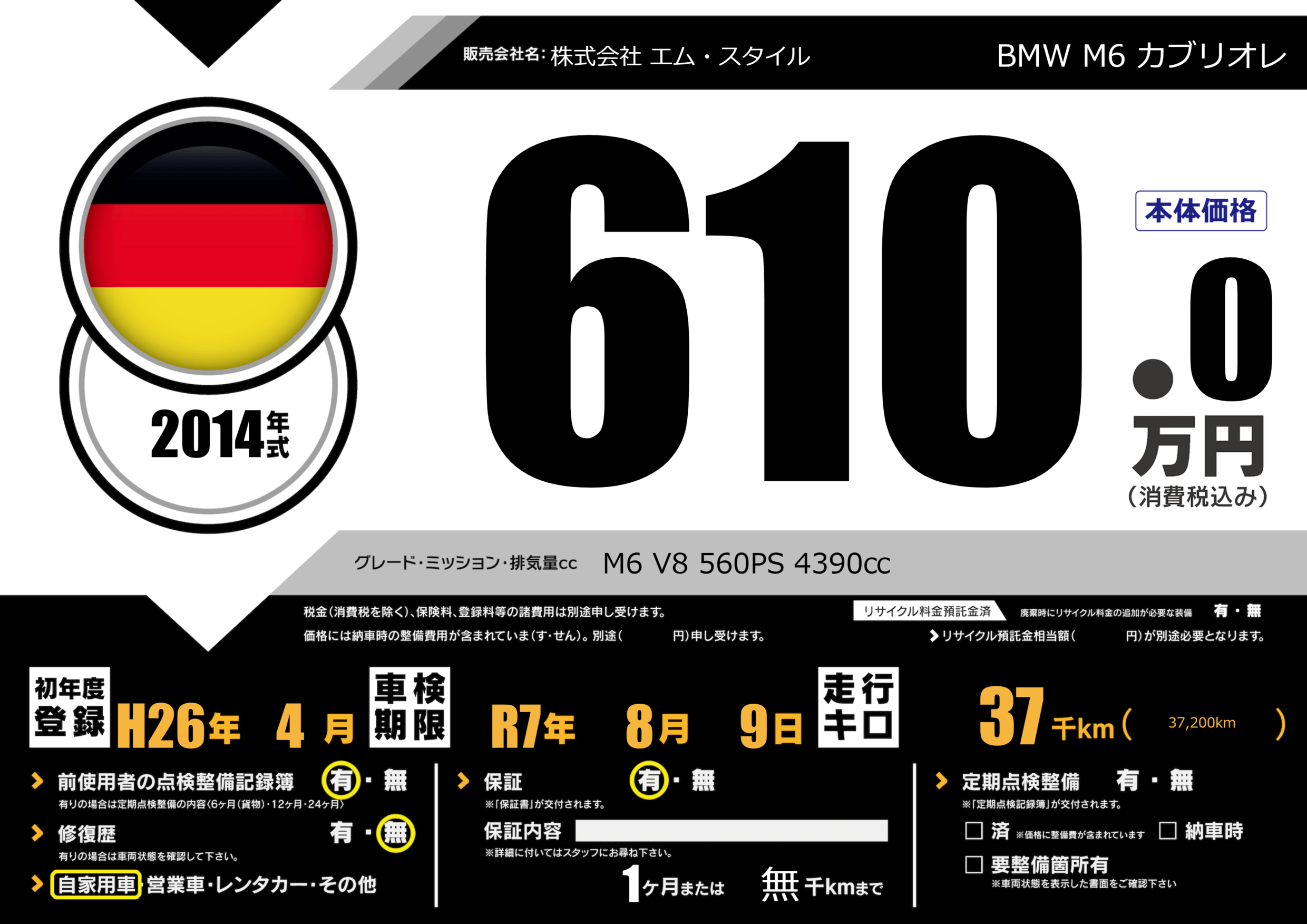 | 車名 | BMW M6 カブリオレ | グレード ミッション 排気量 |