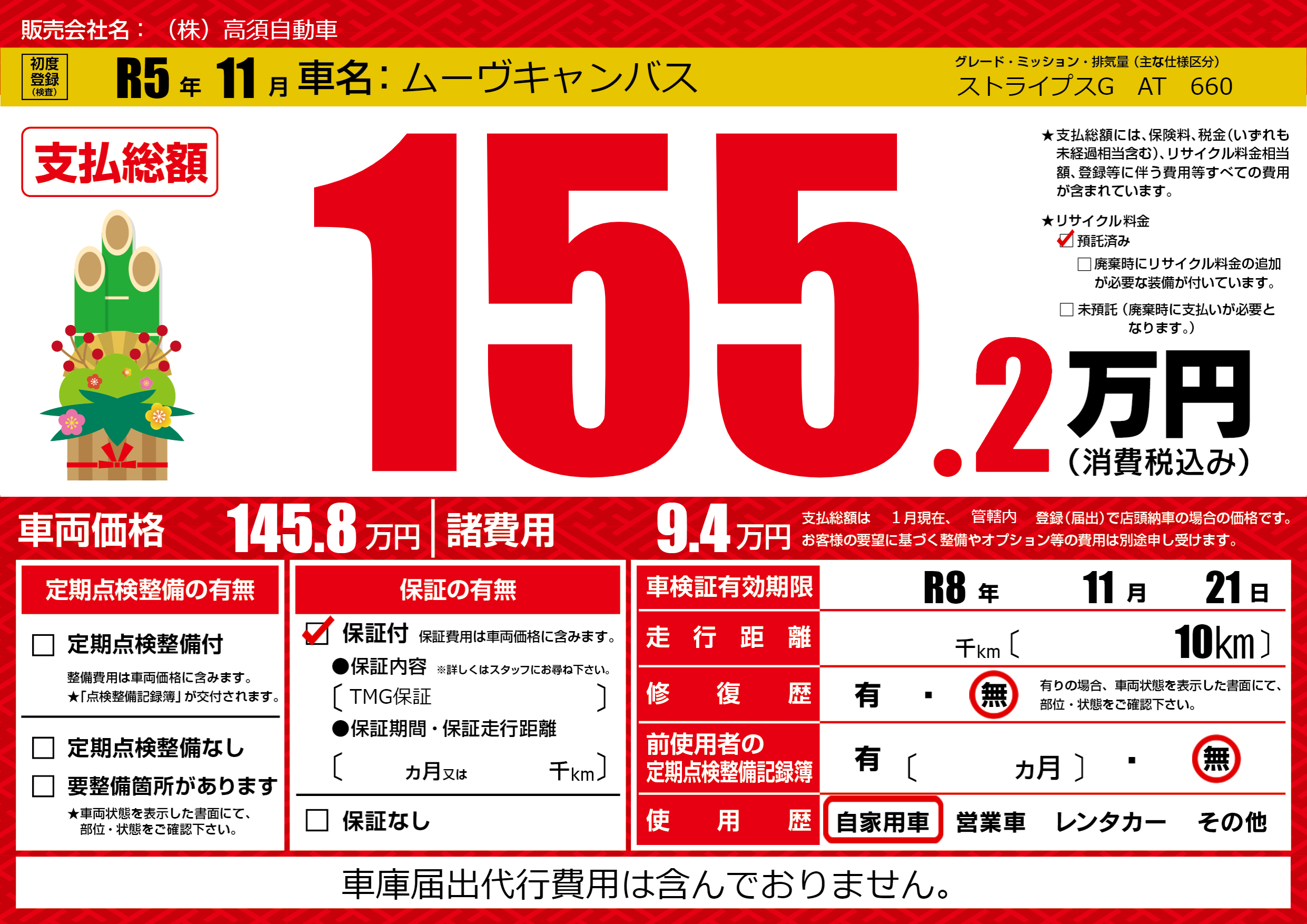 保証付き 保証内容(TMG保証) ---ヶ月または()千kmまで |