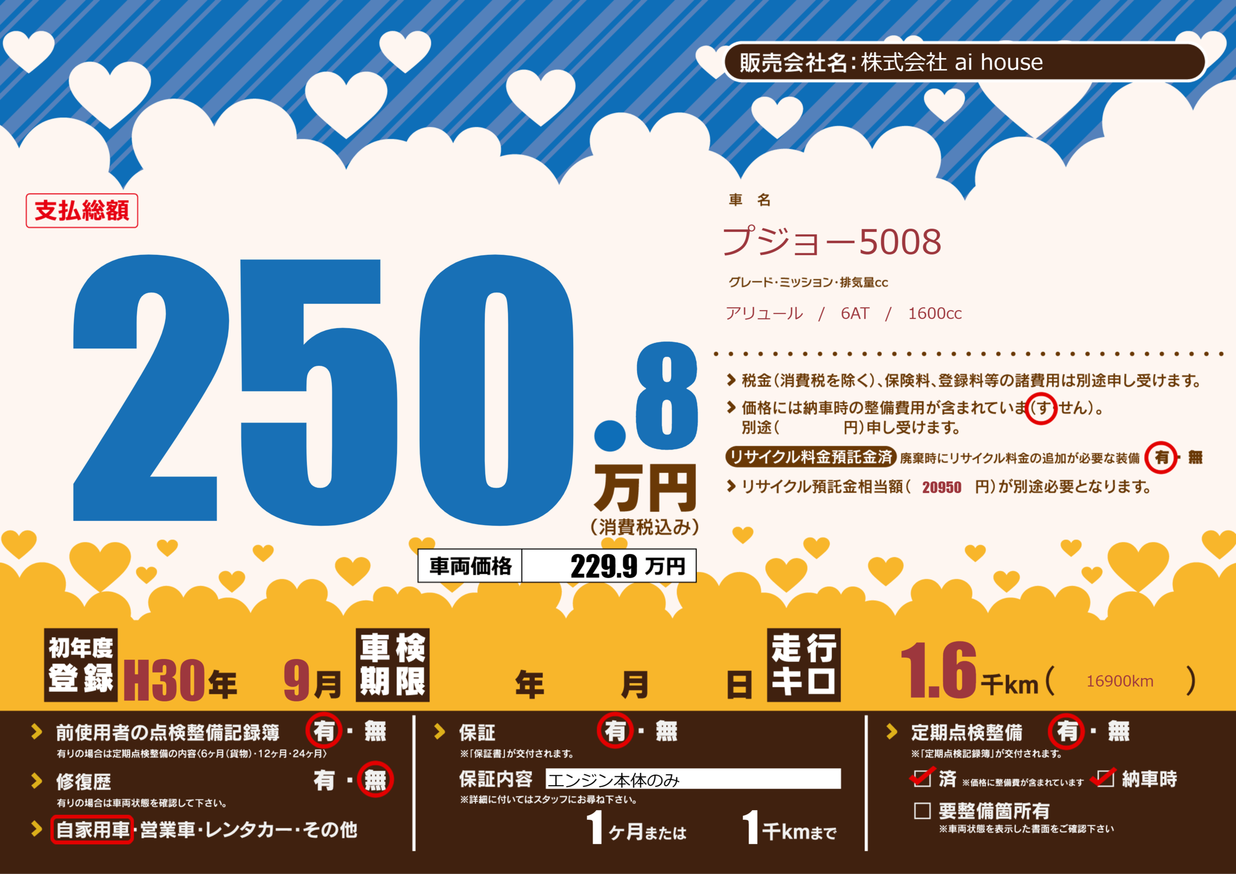 | 車名 | プジョー5008 | グレード ミッション 排気量 |