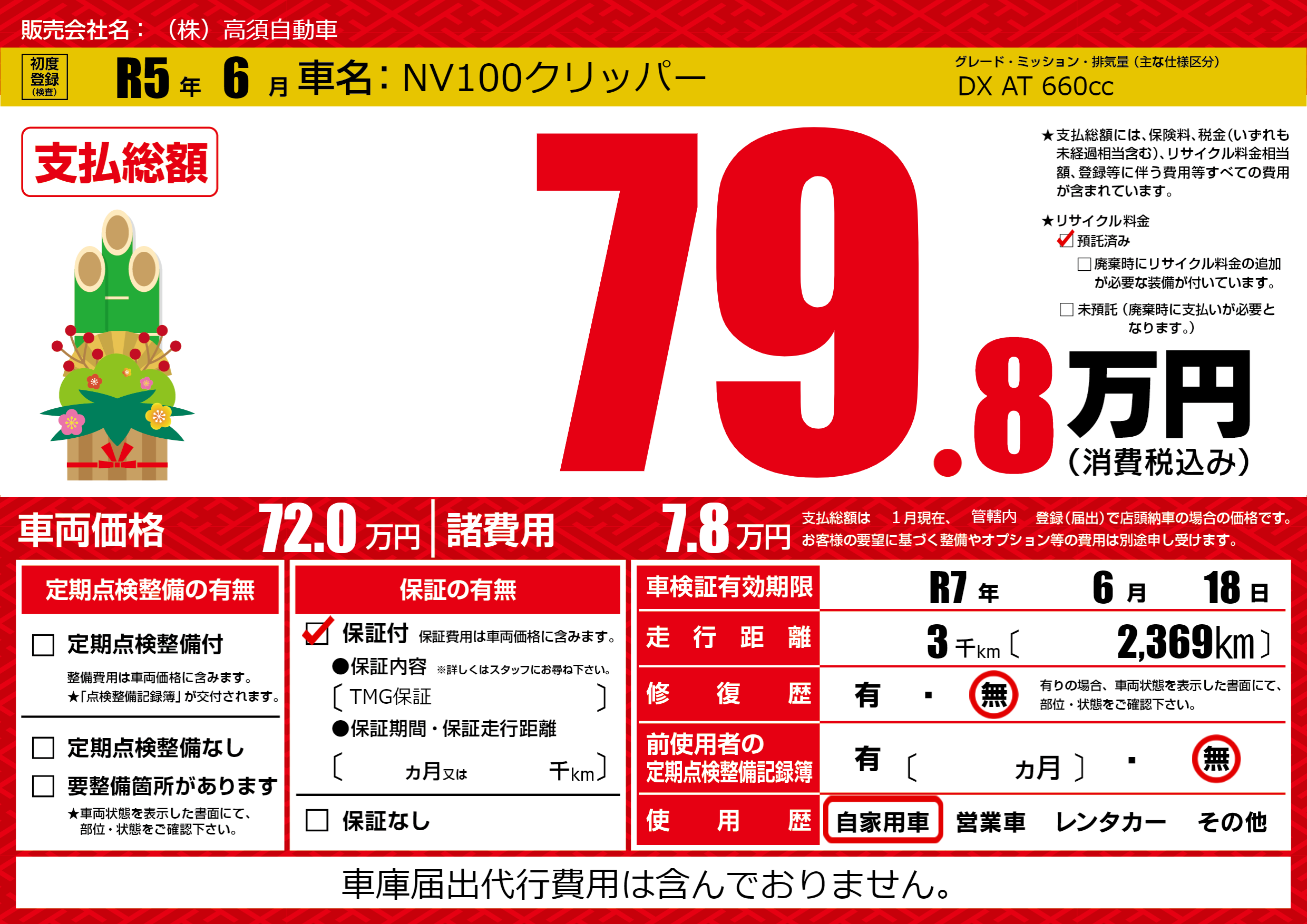 保証なし 保証内容(TMG保証) ---ヶ月または()千kmまで |