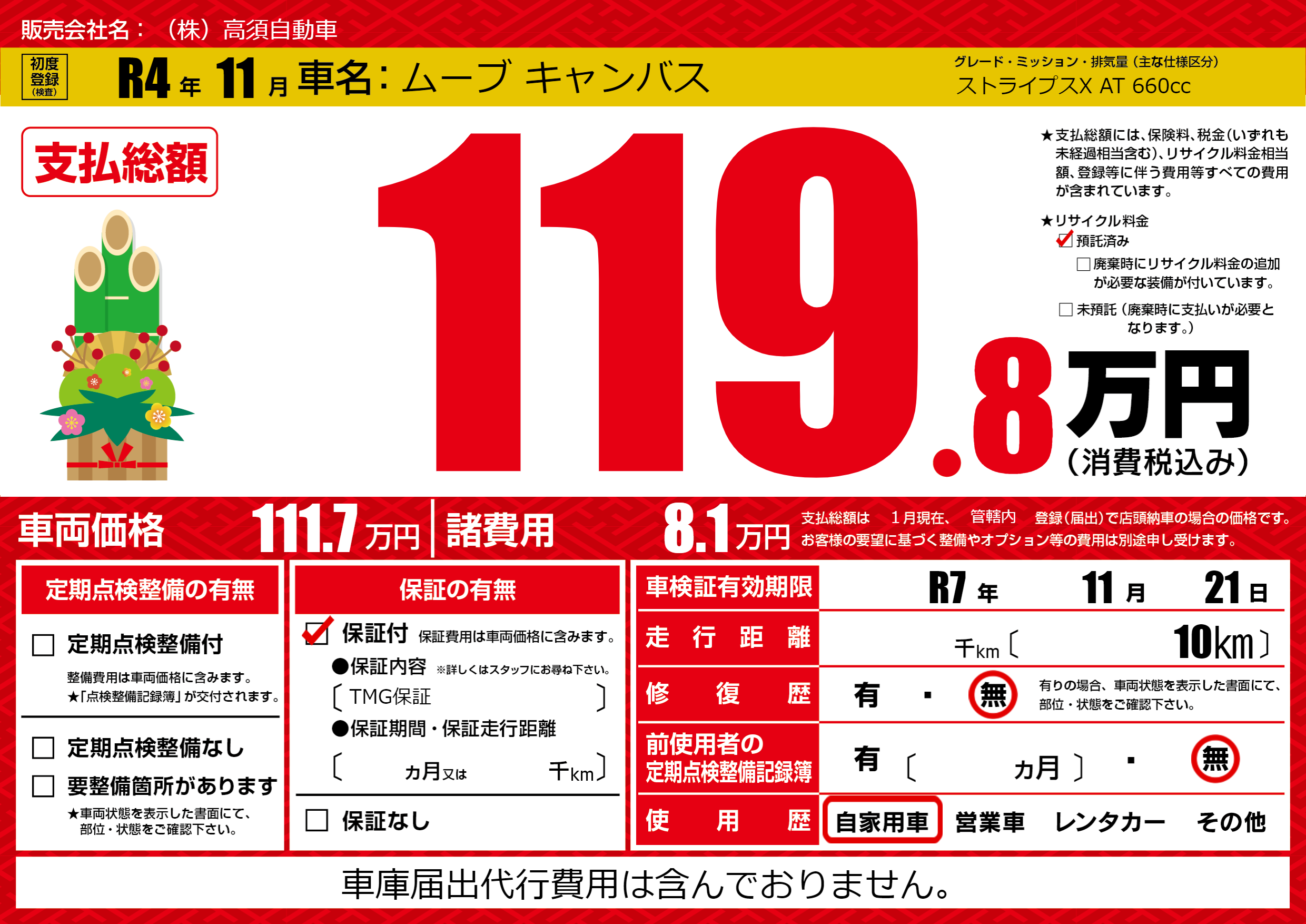 | 走行キロ | - | 初年度登録 | R4年11月 |