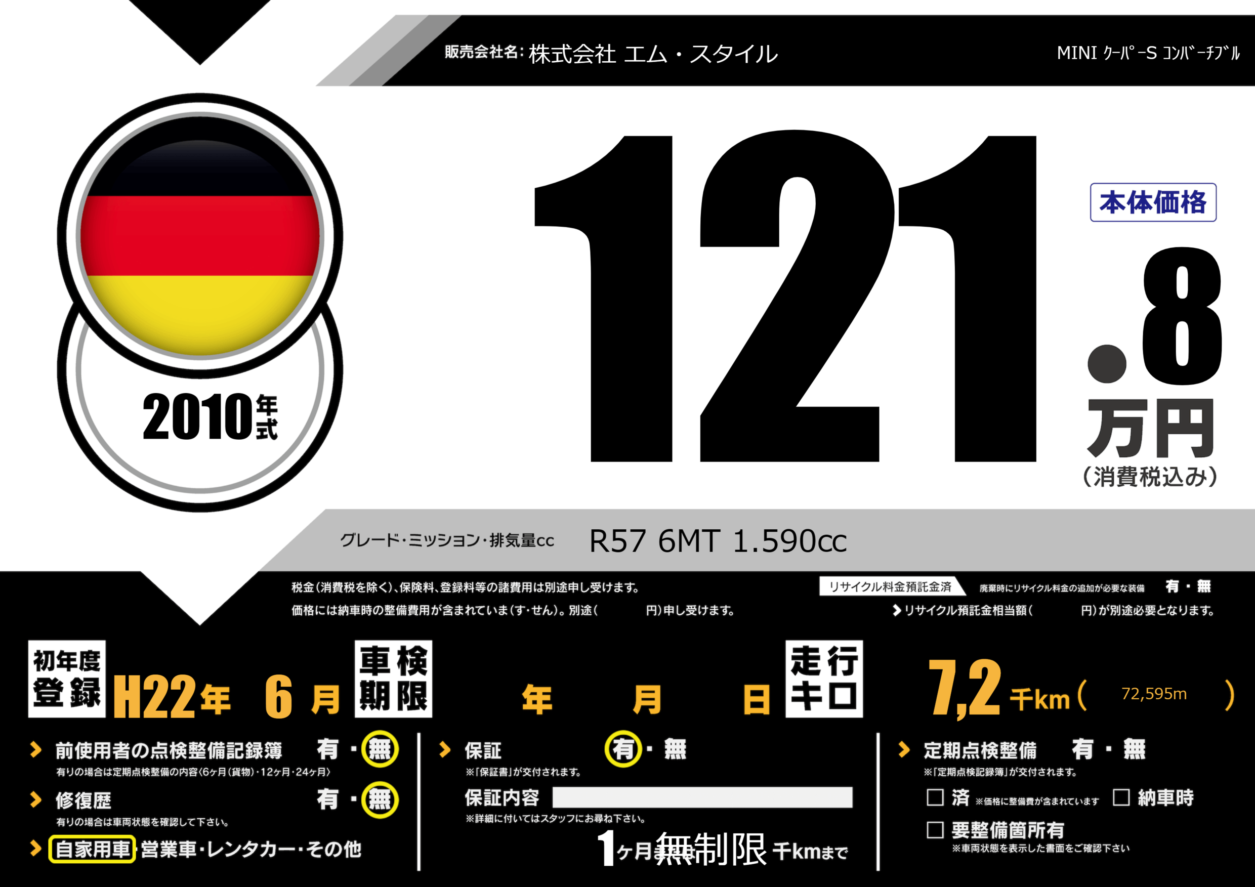 | 車名 | MINI クーパーS コンバーチブル | グレード ミッション 排気量 |