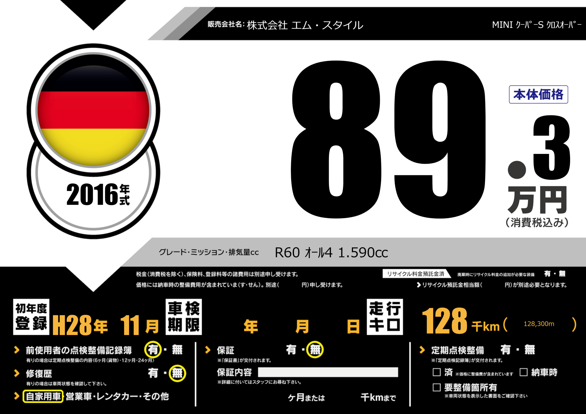 | 車名 | MINI クーパーS クロスオーバー | グレード ミッション 排気量 |