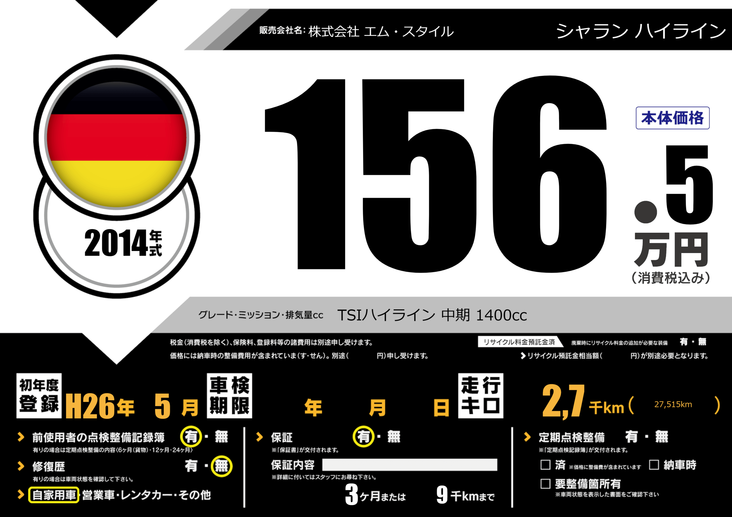 | 車名 | シャラン ハイライン | グレード ミッション 排気量 |