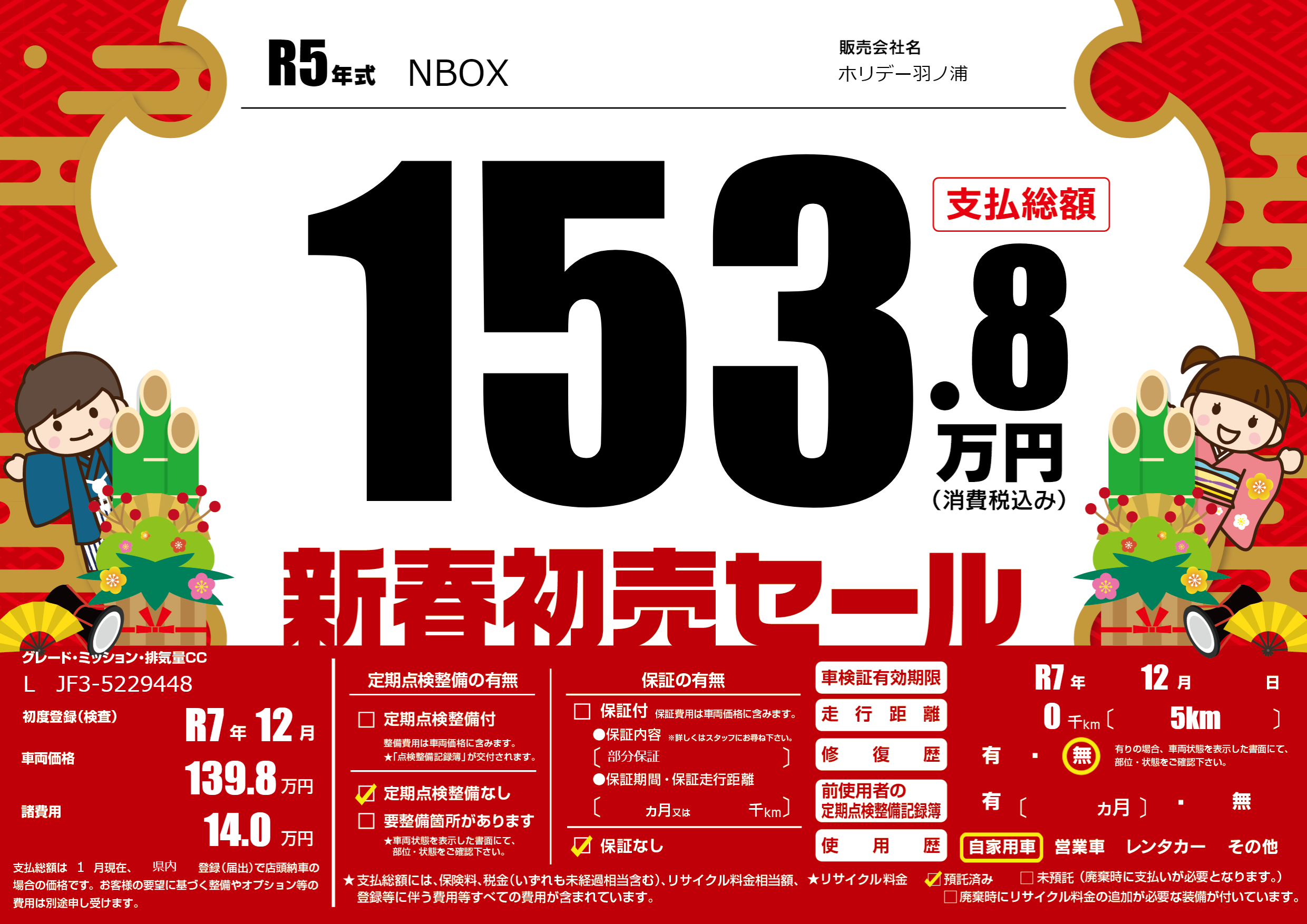 | 走行キロ | - | 初年度登録 | R7年12月 |