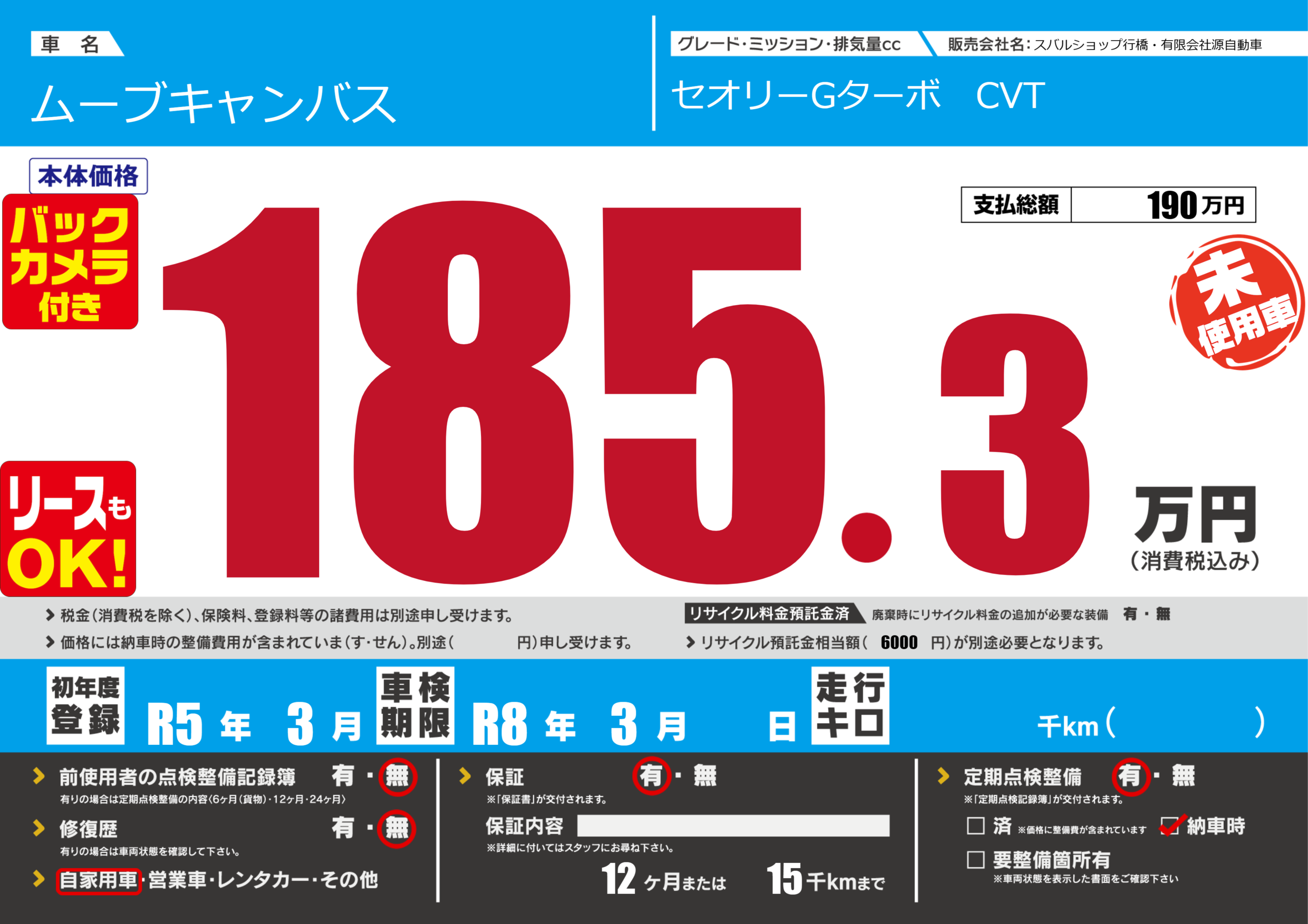| 車名 | ムーブキャンバス | グレード ミッション 排気量 |