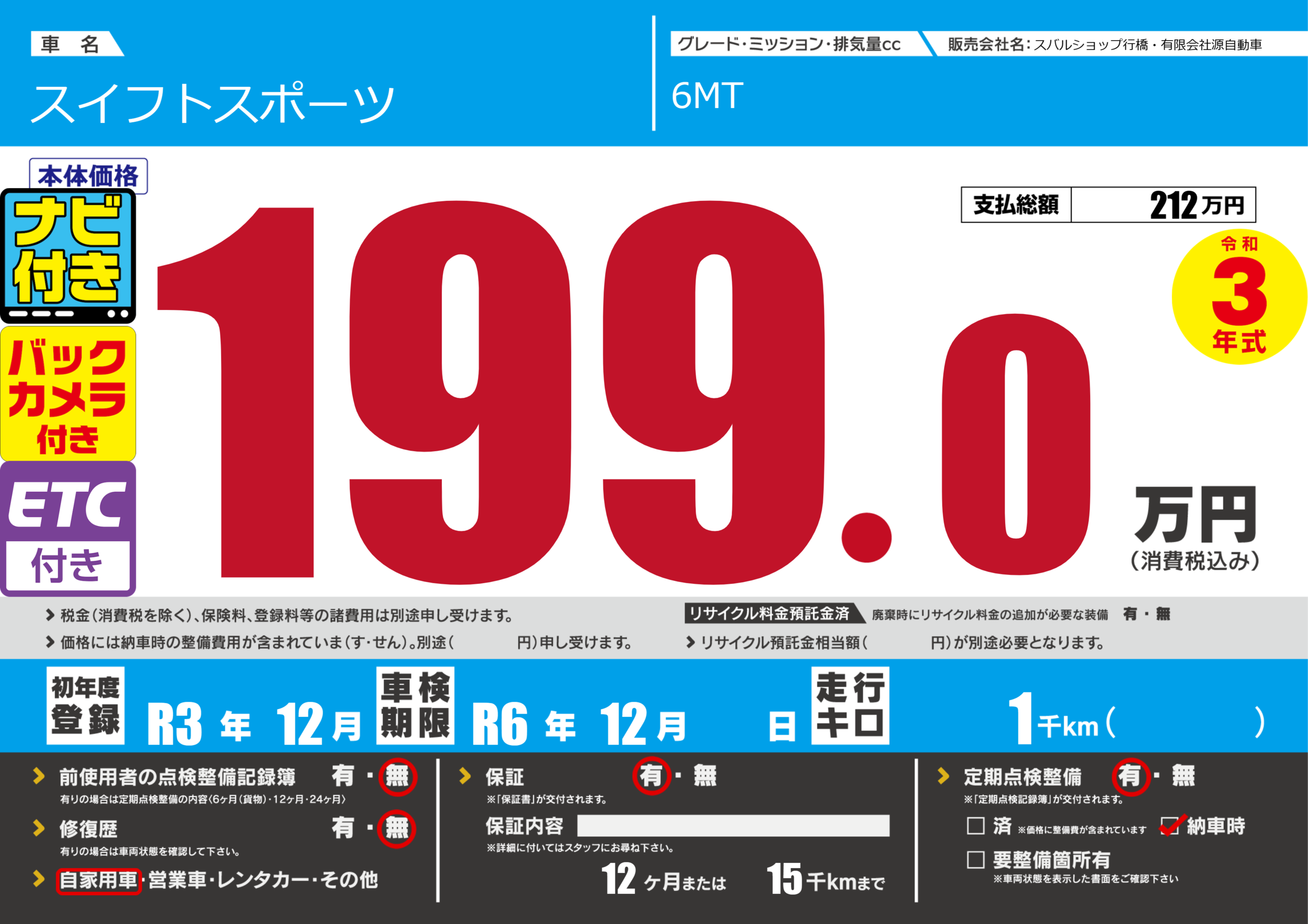 保証付き 保証内容(---) 12ヶ月または(15)千kmまで |