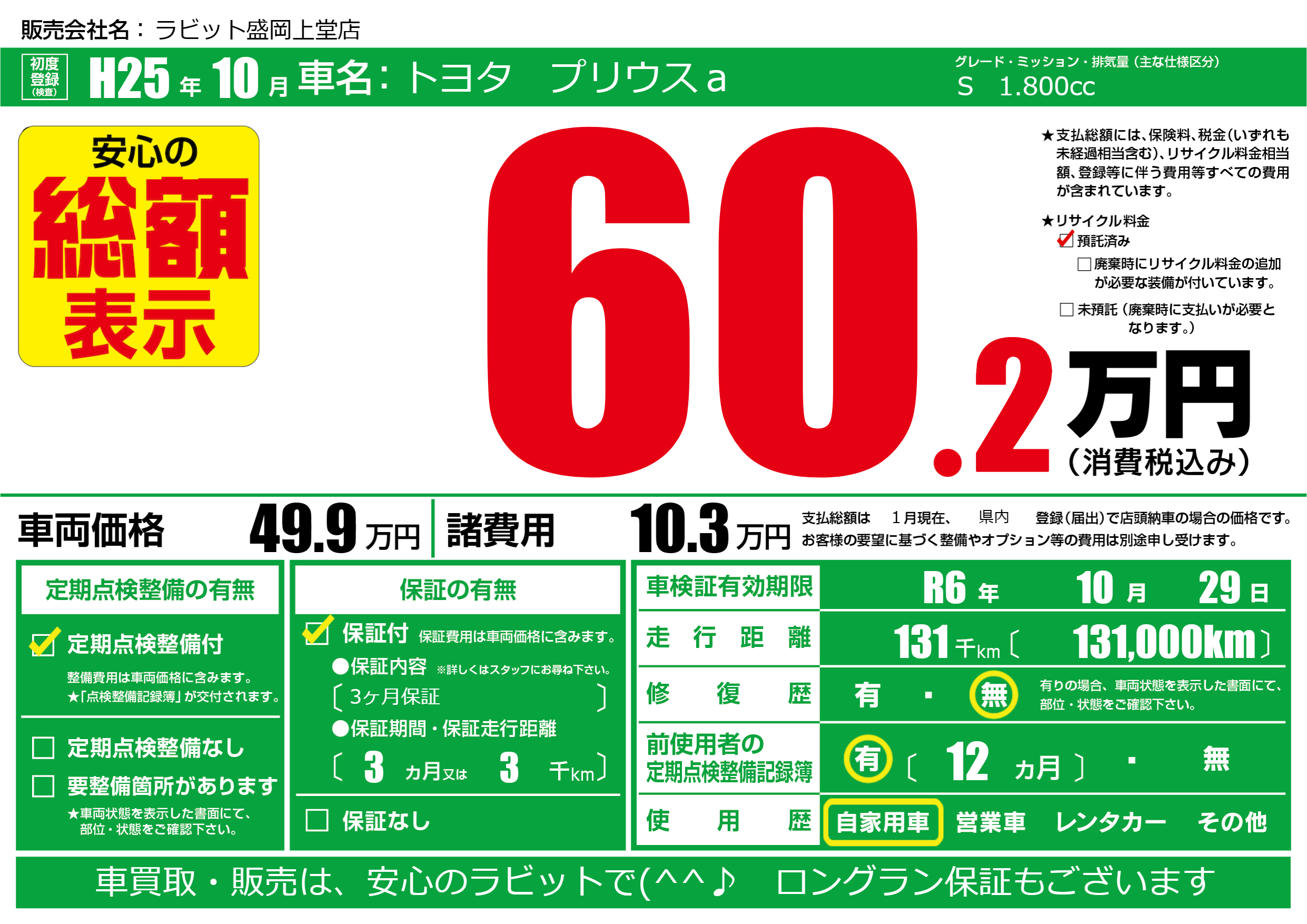| 車名 | トヨタ プリウスa | グレード ミッション 排気量 |
