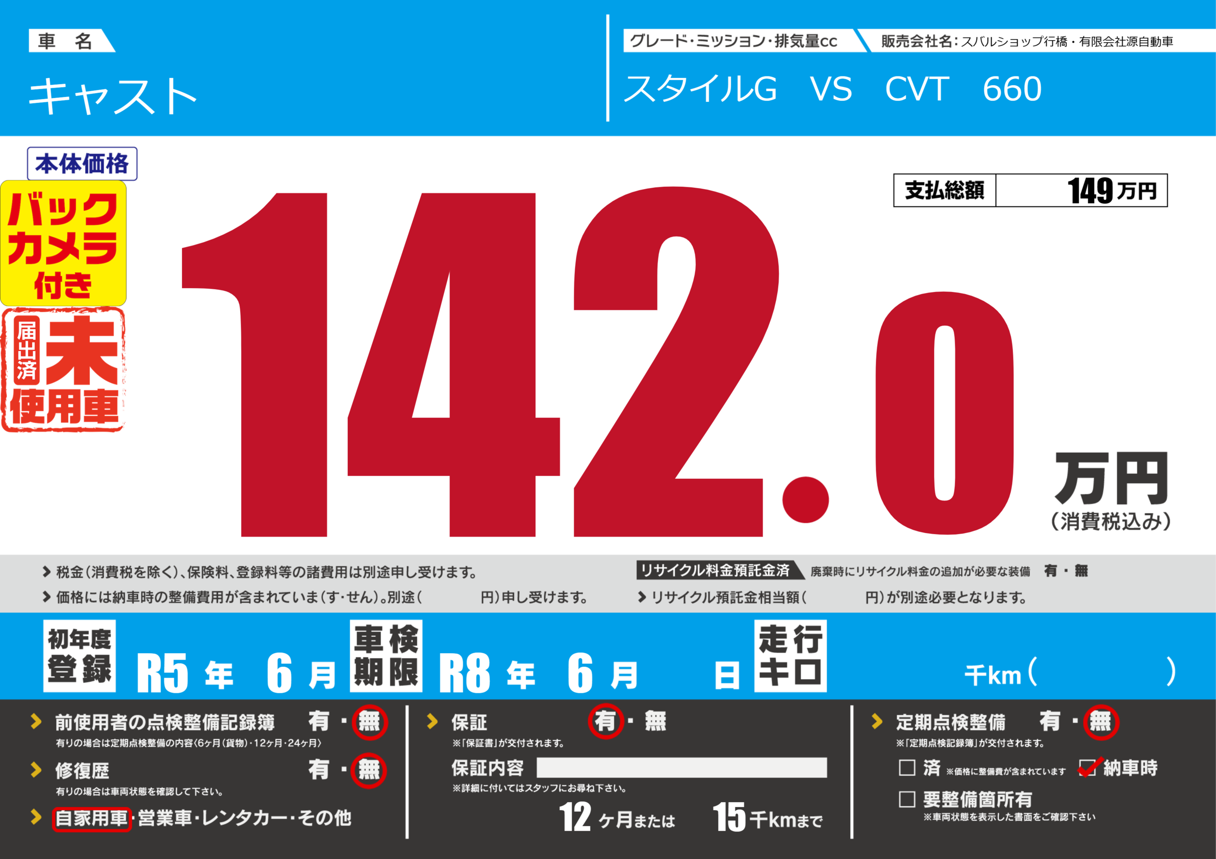 保証付き 保証内容(---) 12ヶ月または(15)千kmまで |