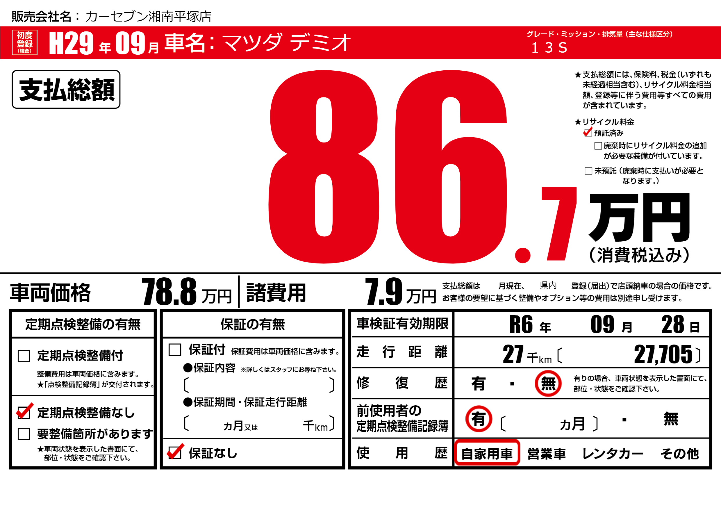 | 走行キロ | 2.7万km | 初年度登録 | H29年09月 |