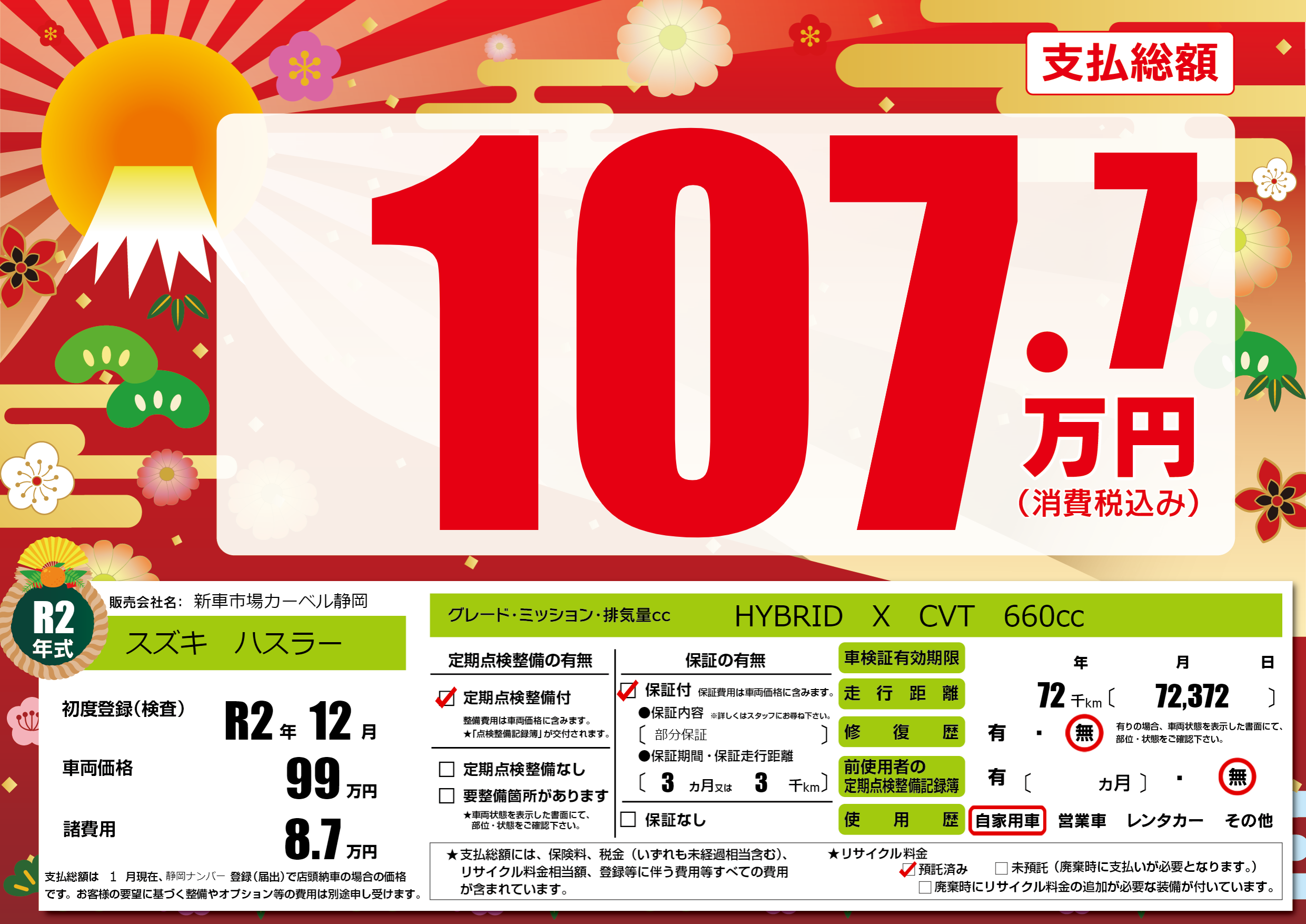 | 車名 | スズキ ハスラー | グレード ミッション 排気量 |