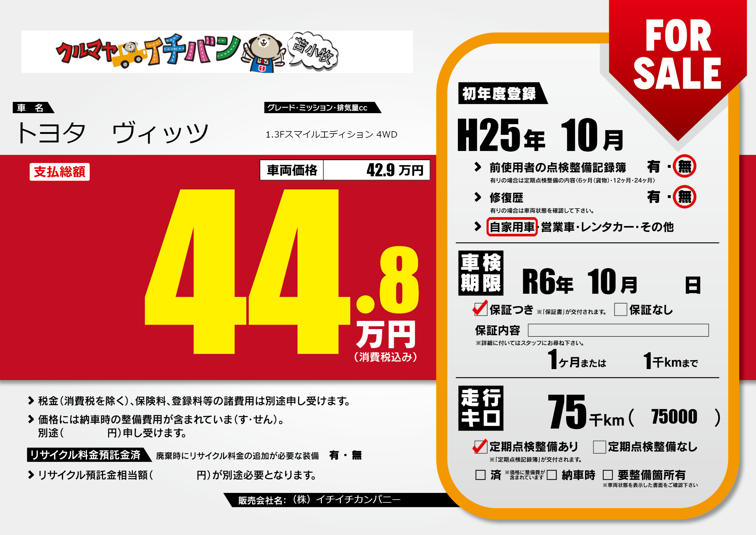 | 車検制限 | R6年 10月 - 日 | ||