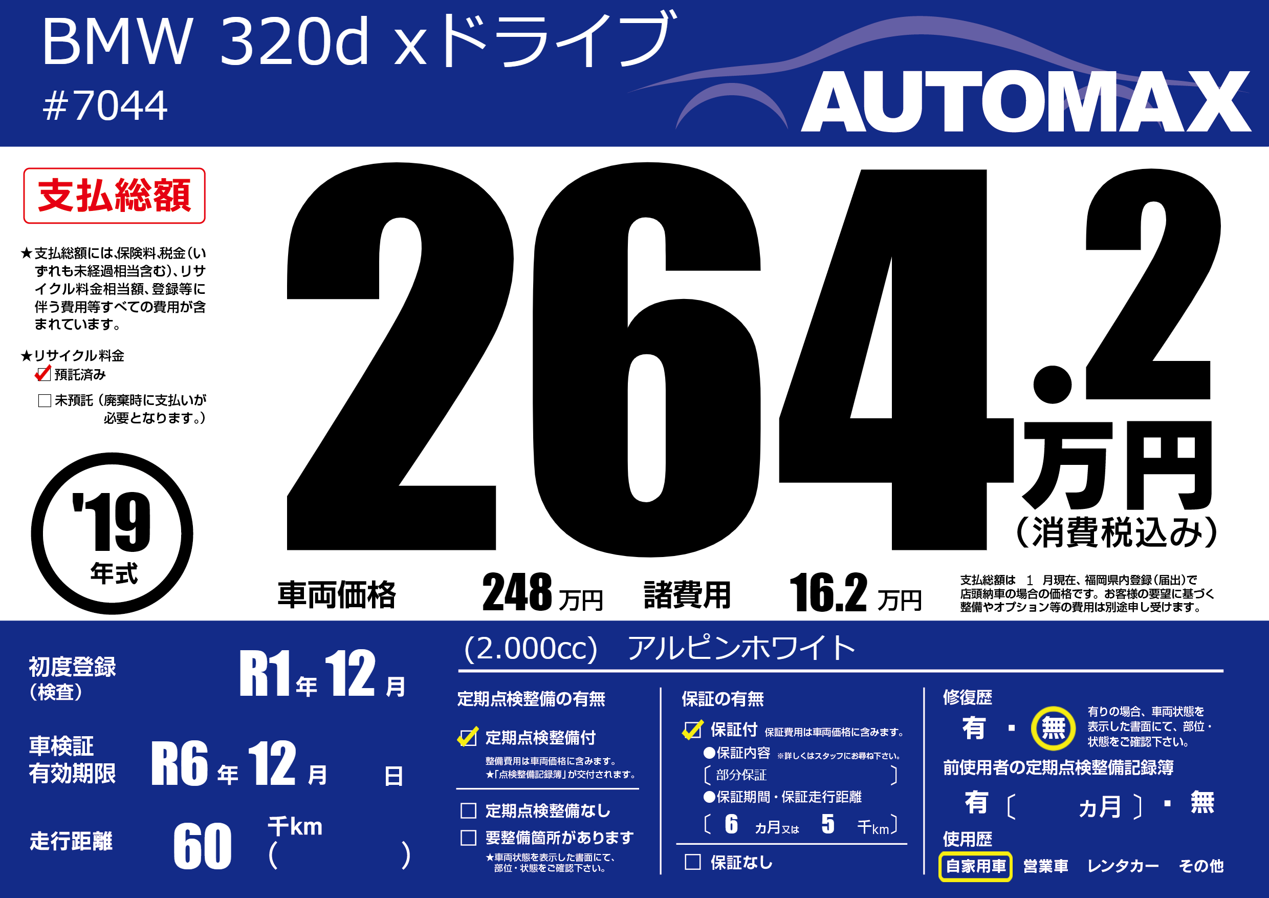 | 車名 | BMW 320d xドライブ | グレード ミッション 排気量 |