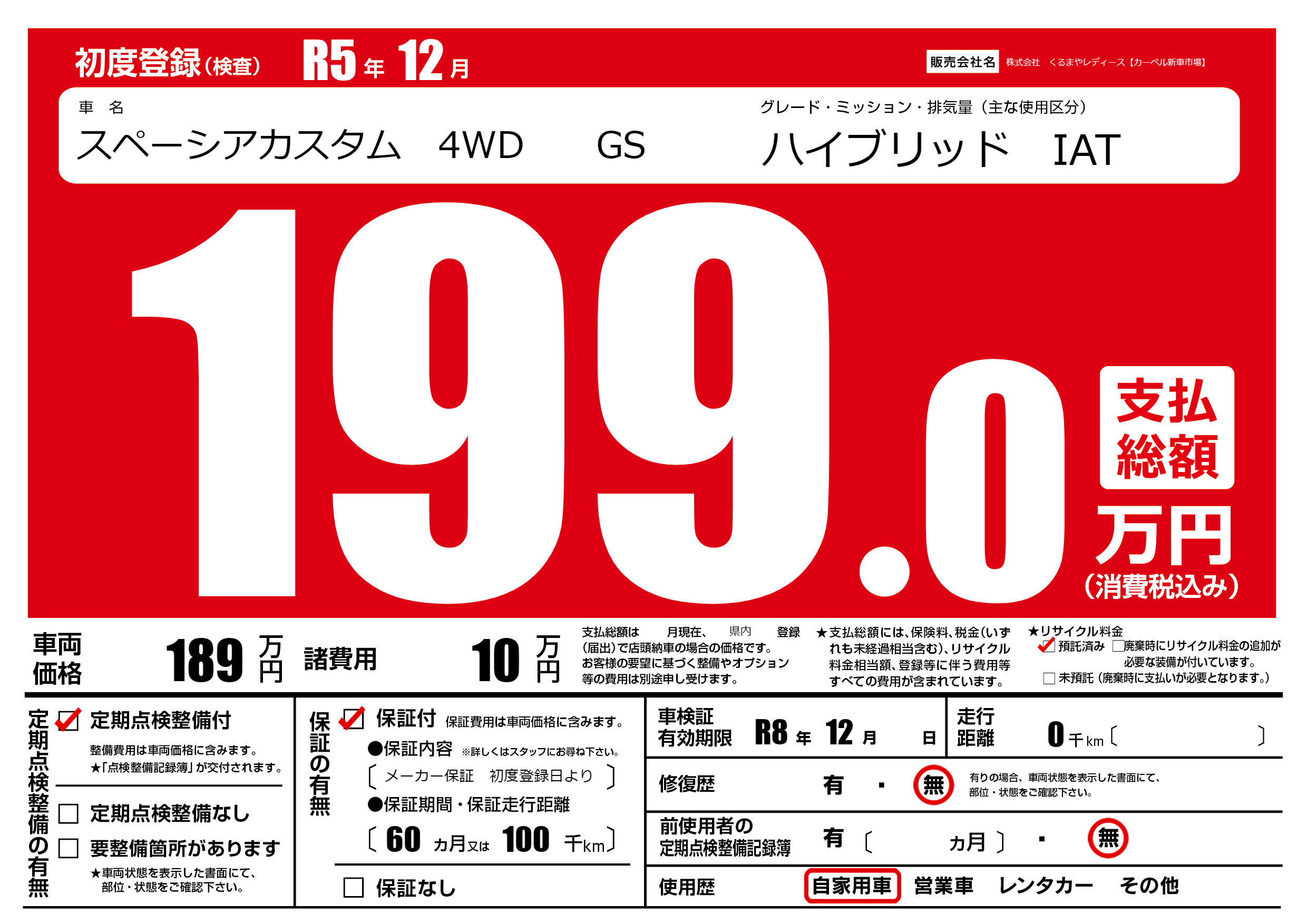 | 車名 | スペーシアカスタム 4WD GS | グレード ミッション 排気量 |