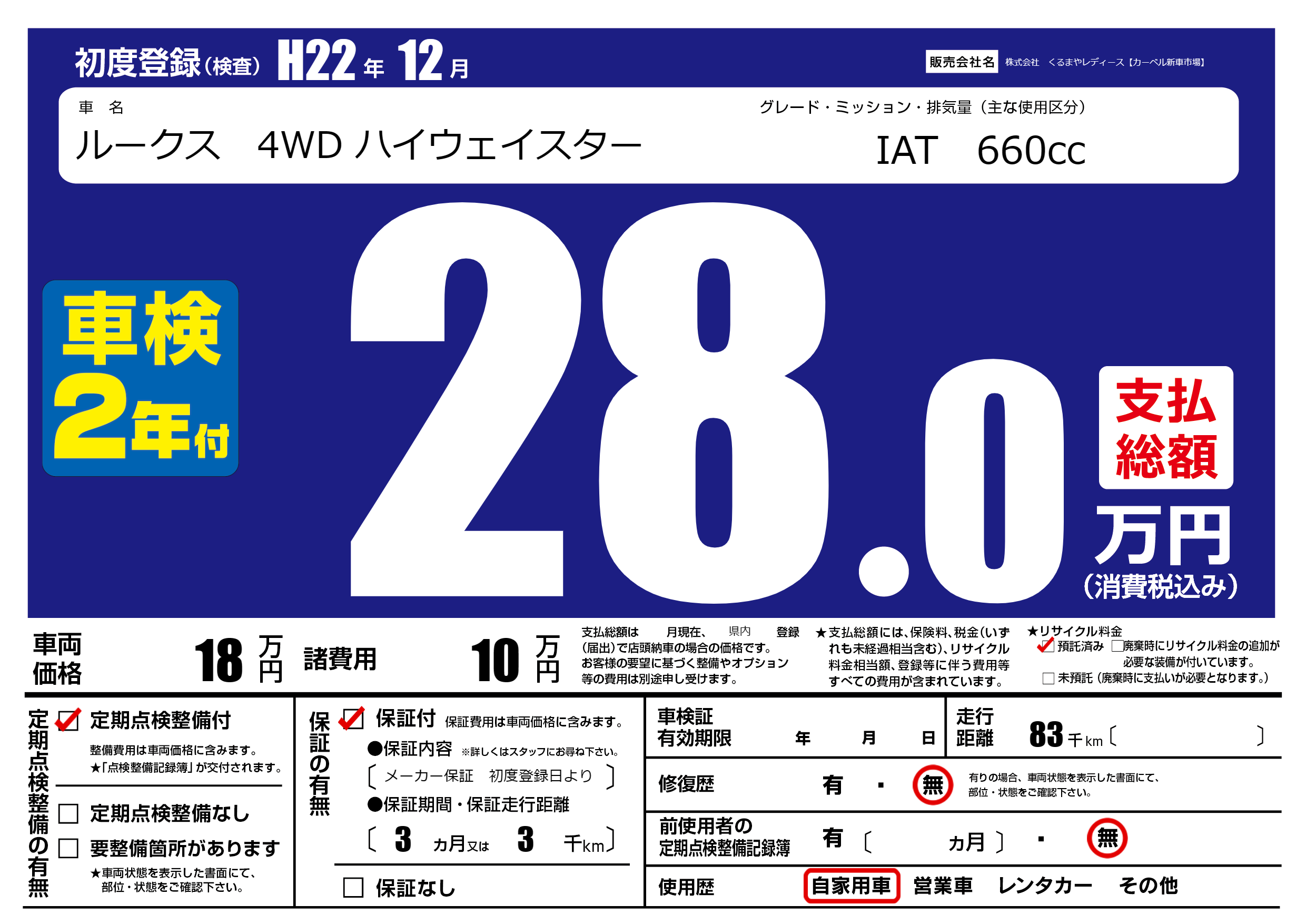 | 走行キロ | 8.3万km | 初年度登録 | H22年12月 |