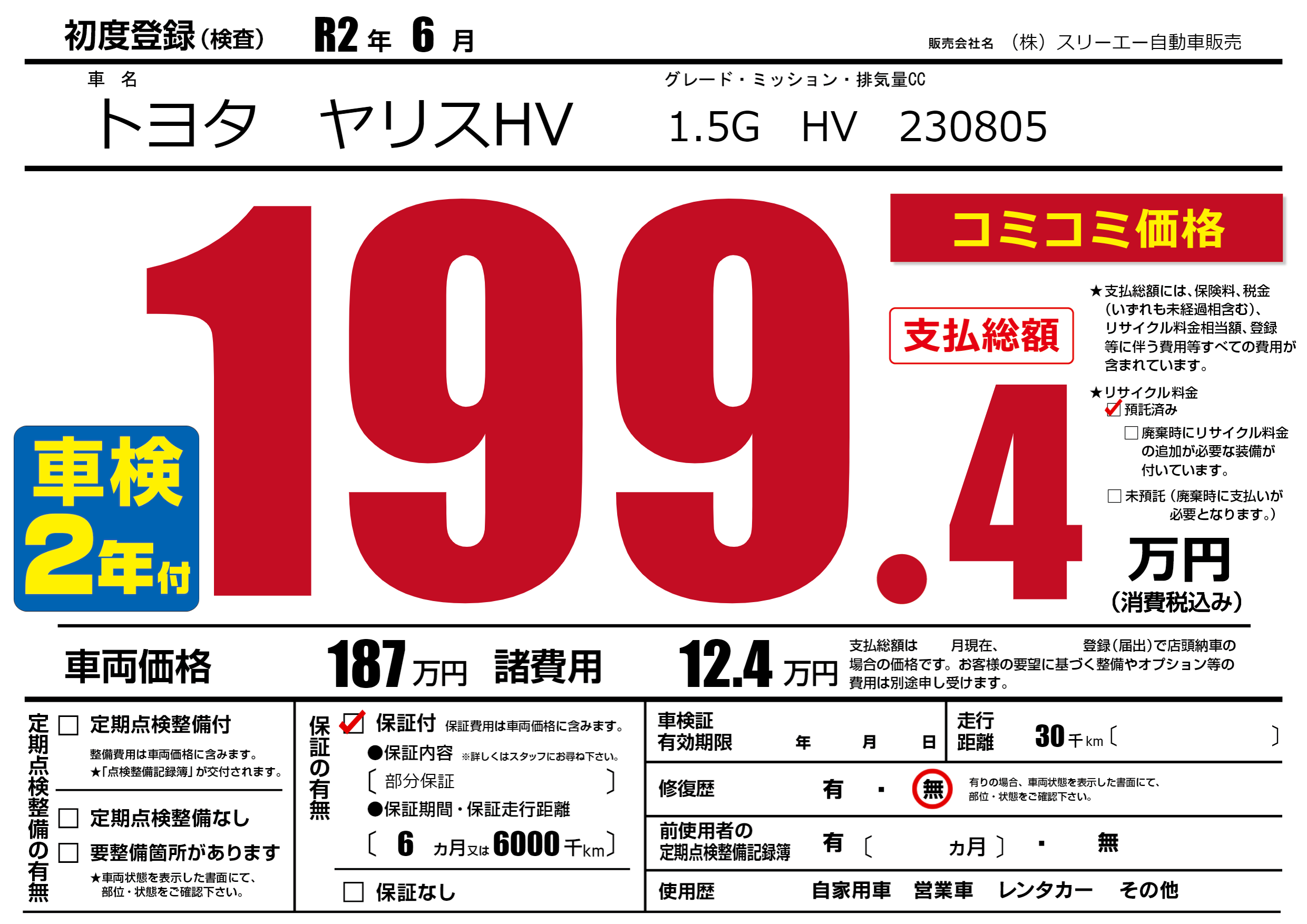| 車名 | トヨタ ヤリスHV | グレード ミッション 排気量 |