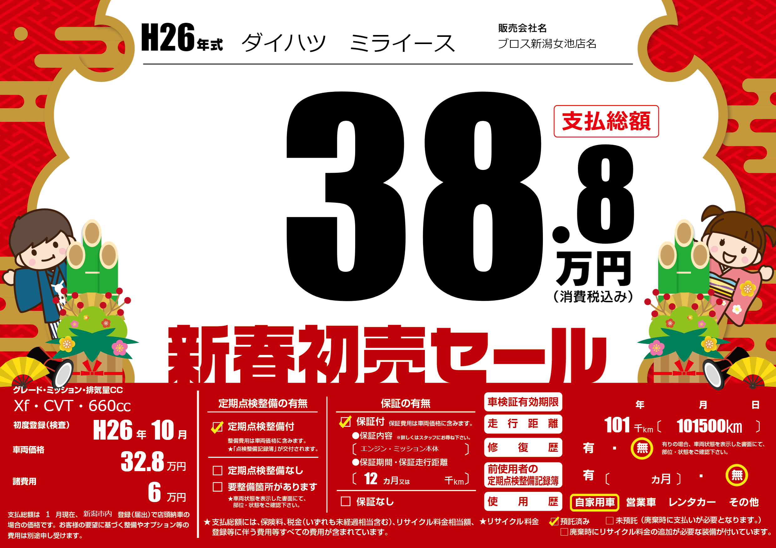 | 車名 | ダイハツ ミライース | グレード ミッション 排気量 |