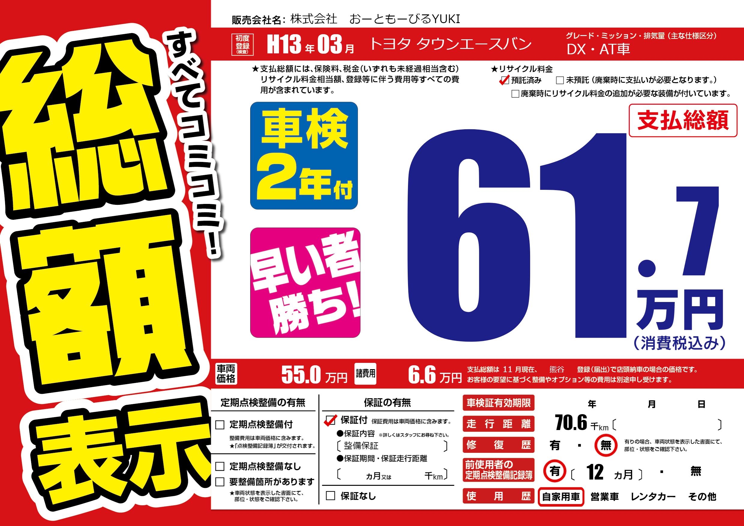 | 走行キロ | 7万km | 初年度登録 | H13年03月 |