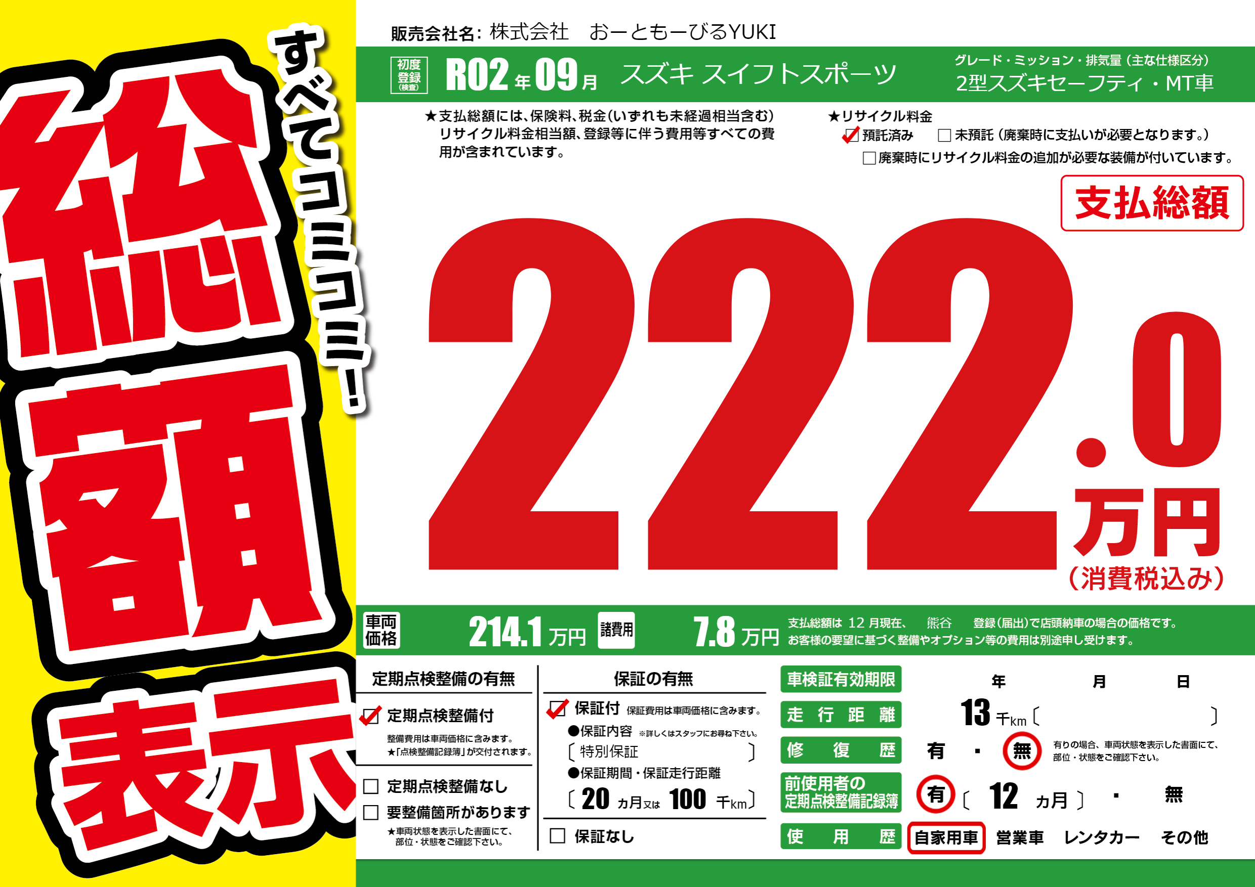 | 車名 | スズキ スイフトスポーツ | グレード ミッション 排気量 |