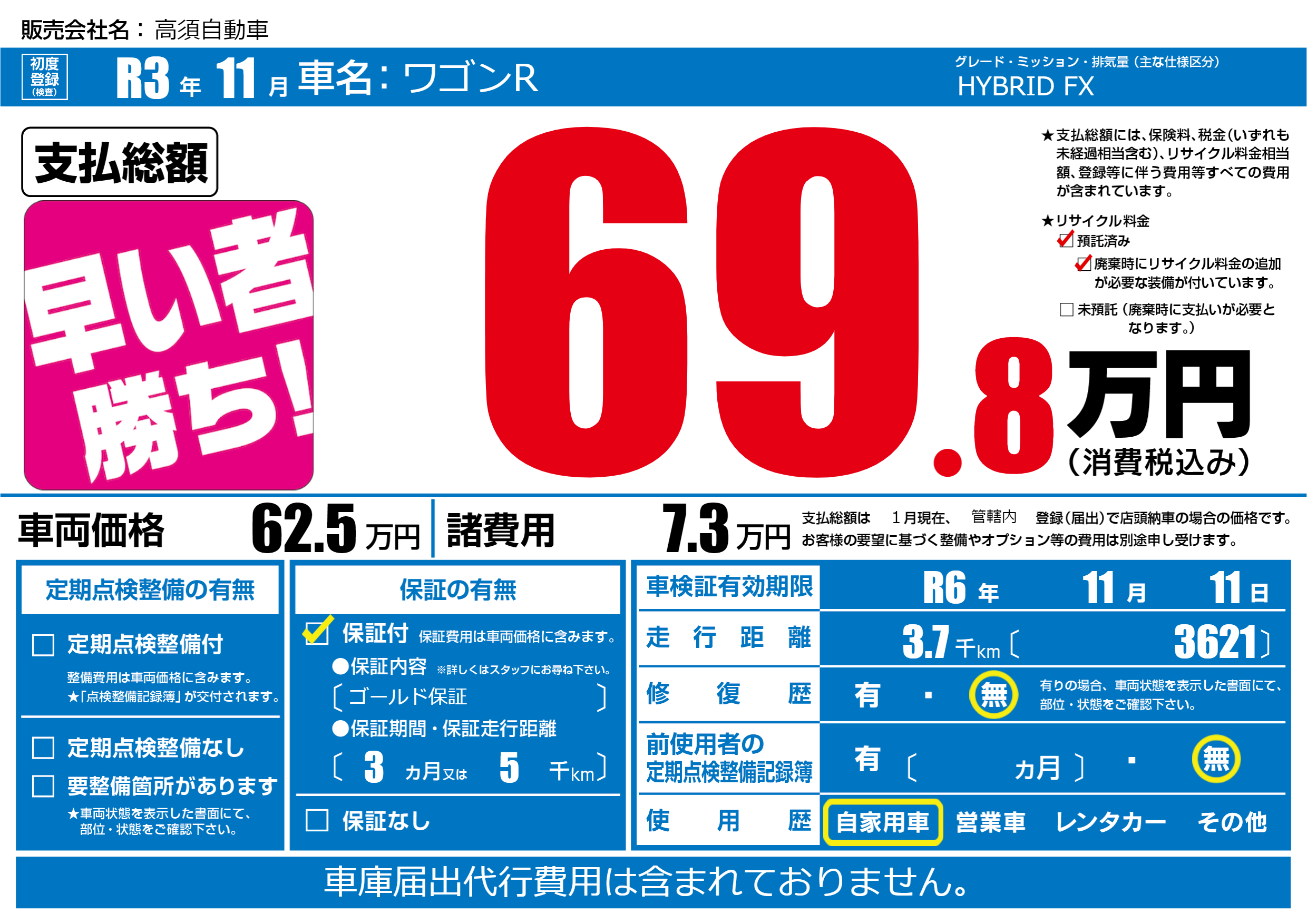 | 車名 | ワゴンR | グレード ミッション 排気量 |