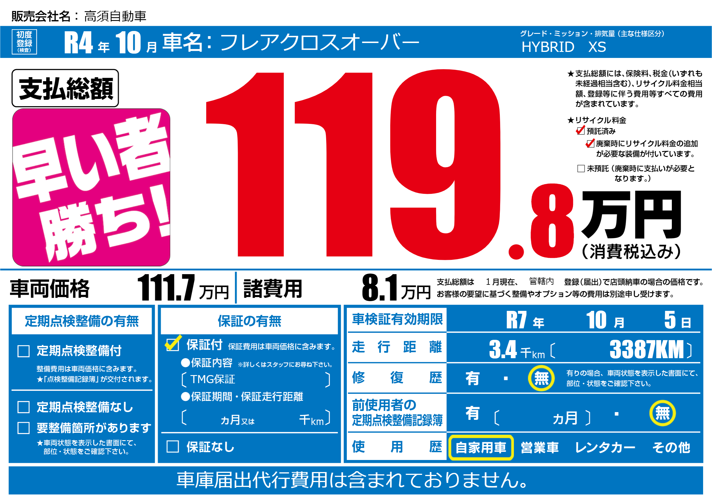 | 走行キロ | 0.3万km | 初年度登録 | R4年10月 |