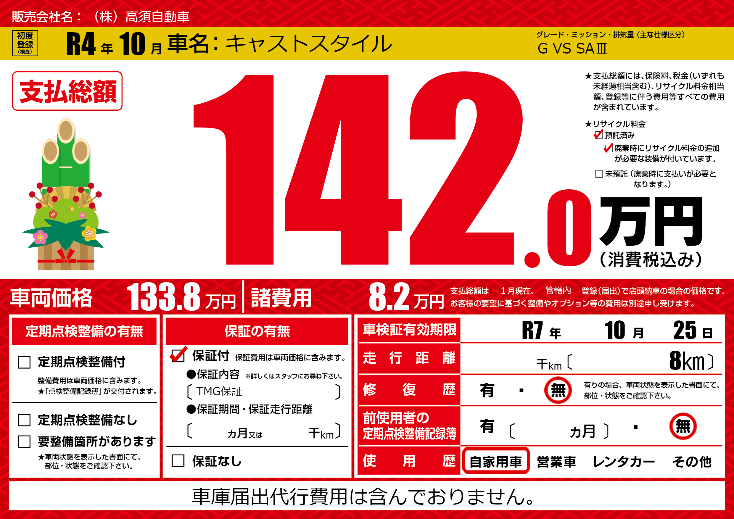 | 走行キロ | - | 初年度登録 | R4年10月 |