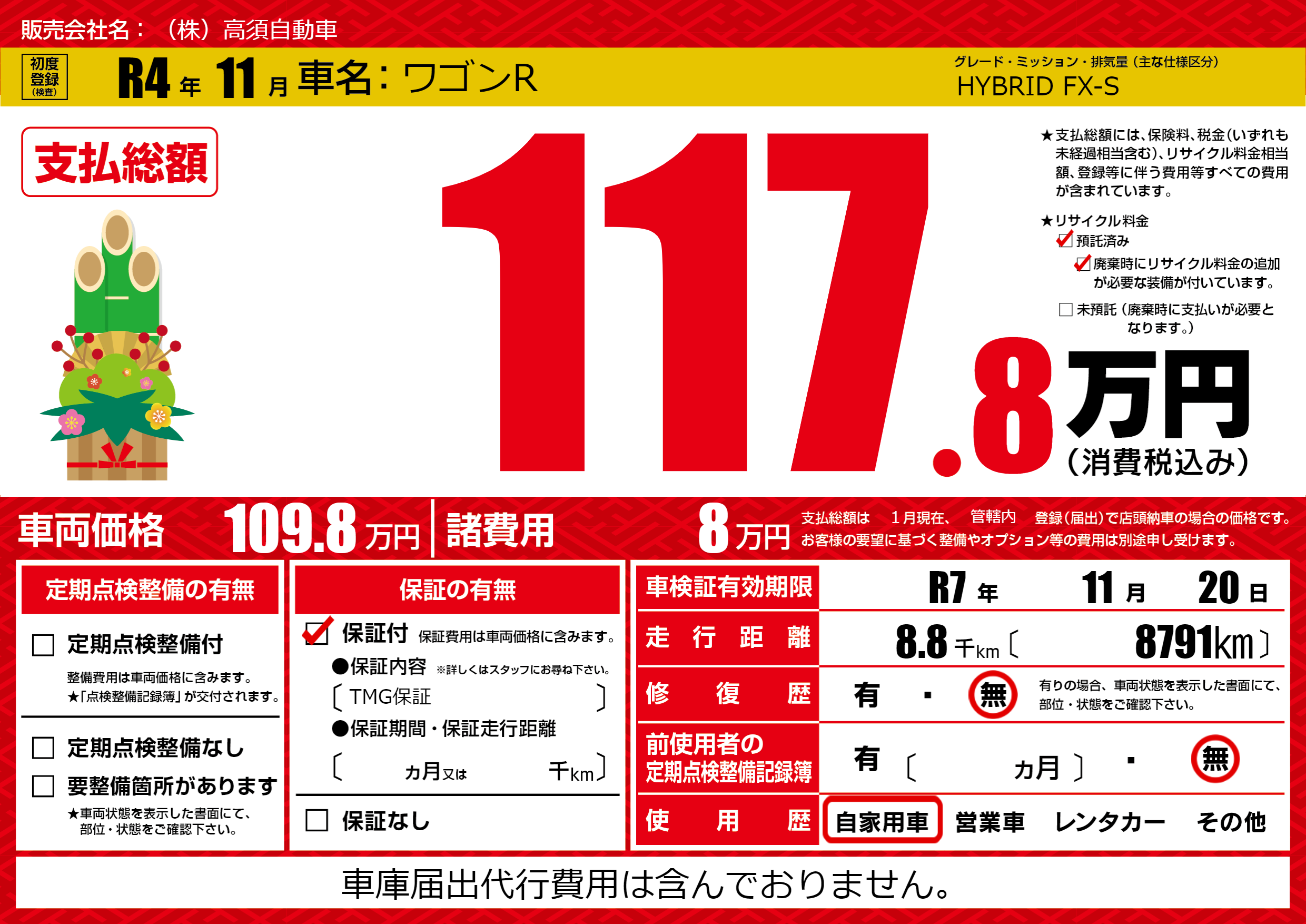 | 車名 | ワゴンR | グレード ミッション 排気量 |