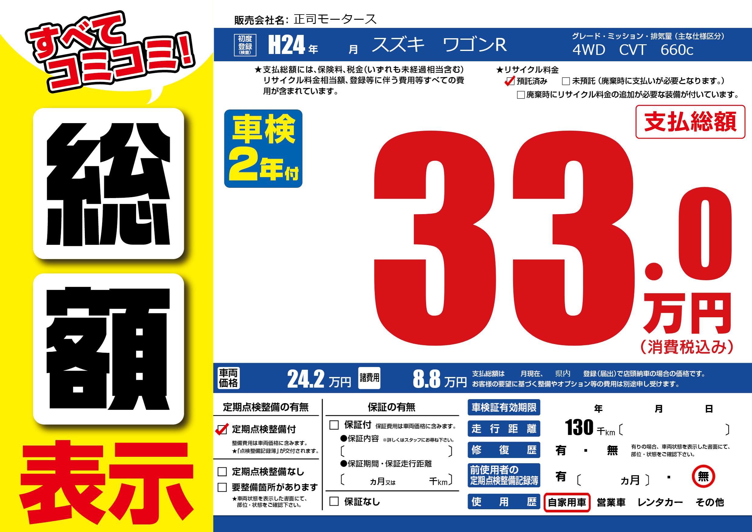 | 車名 | スズキ ワゴンR | グレード ミッション 排気量 |