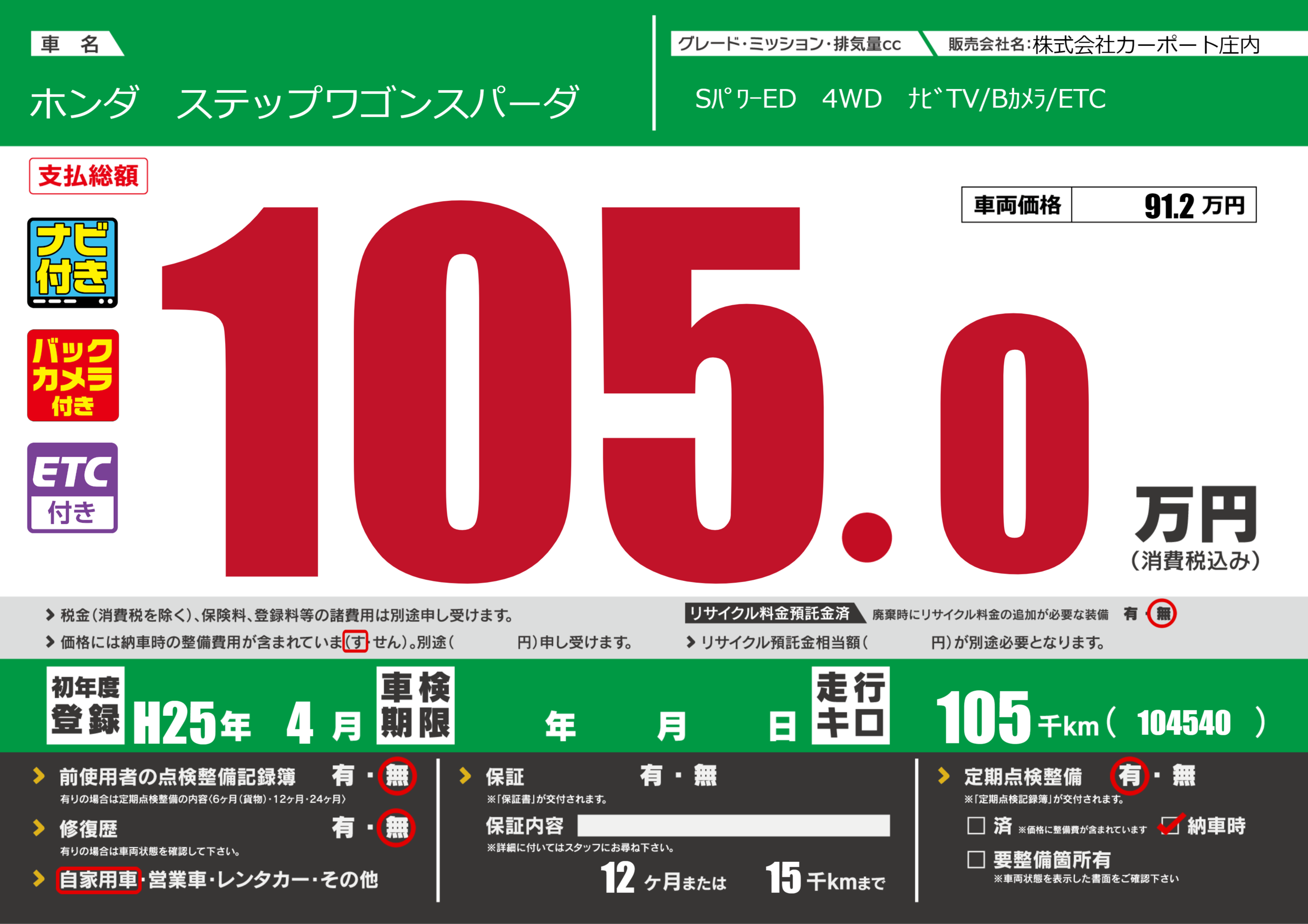 | 定期点検整備 | 定期点検整備あり 納車時あり | ||