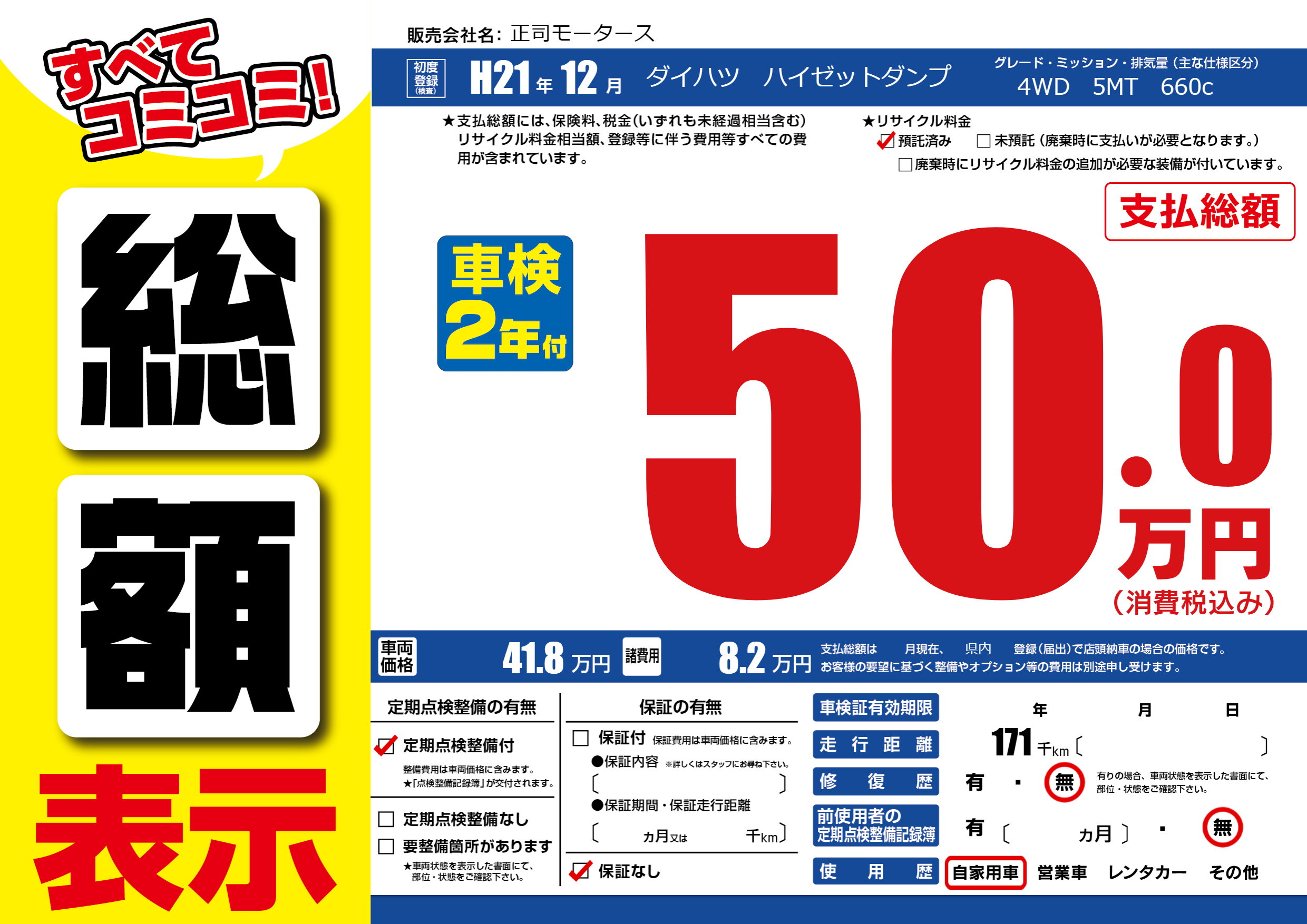 | 走行キロ | 17.1万km | 初年度登録 | H21年12月 |