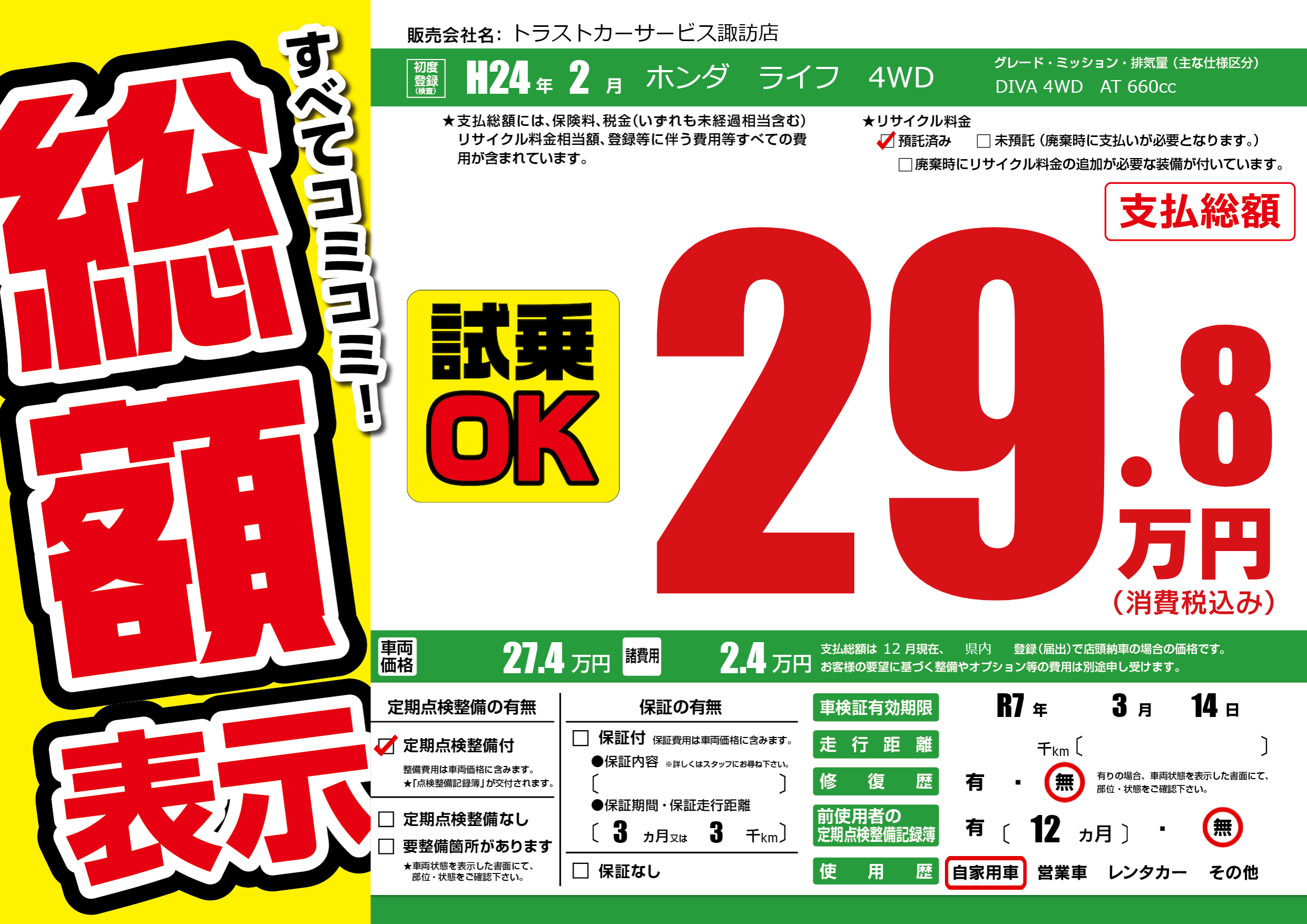 | 車名 | ホンダ ライフ 4WD | グレード ミッション 排気量 |
