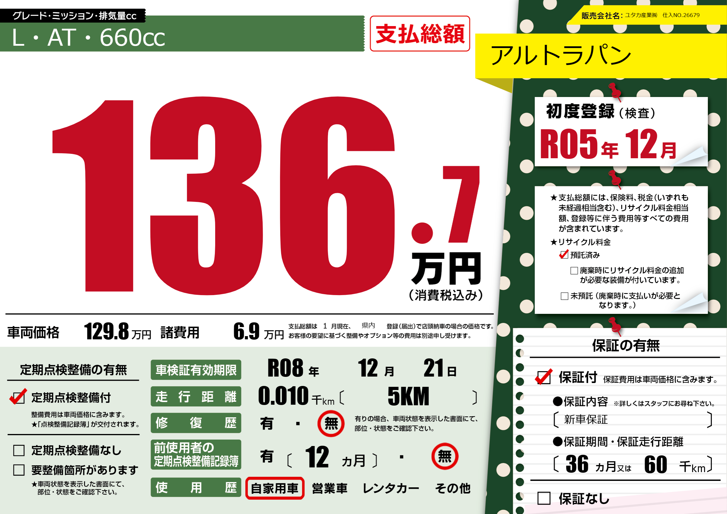 | 走行キロ | - | 初年度登録 | R05年12月 |
