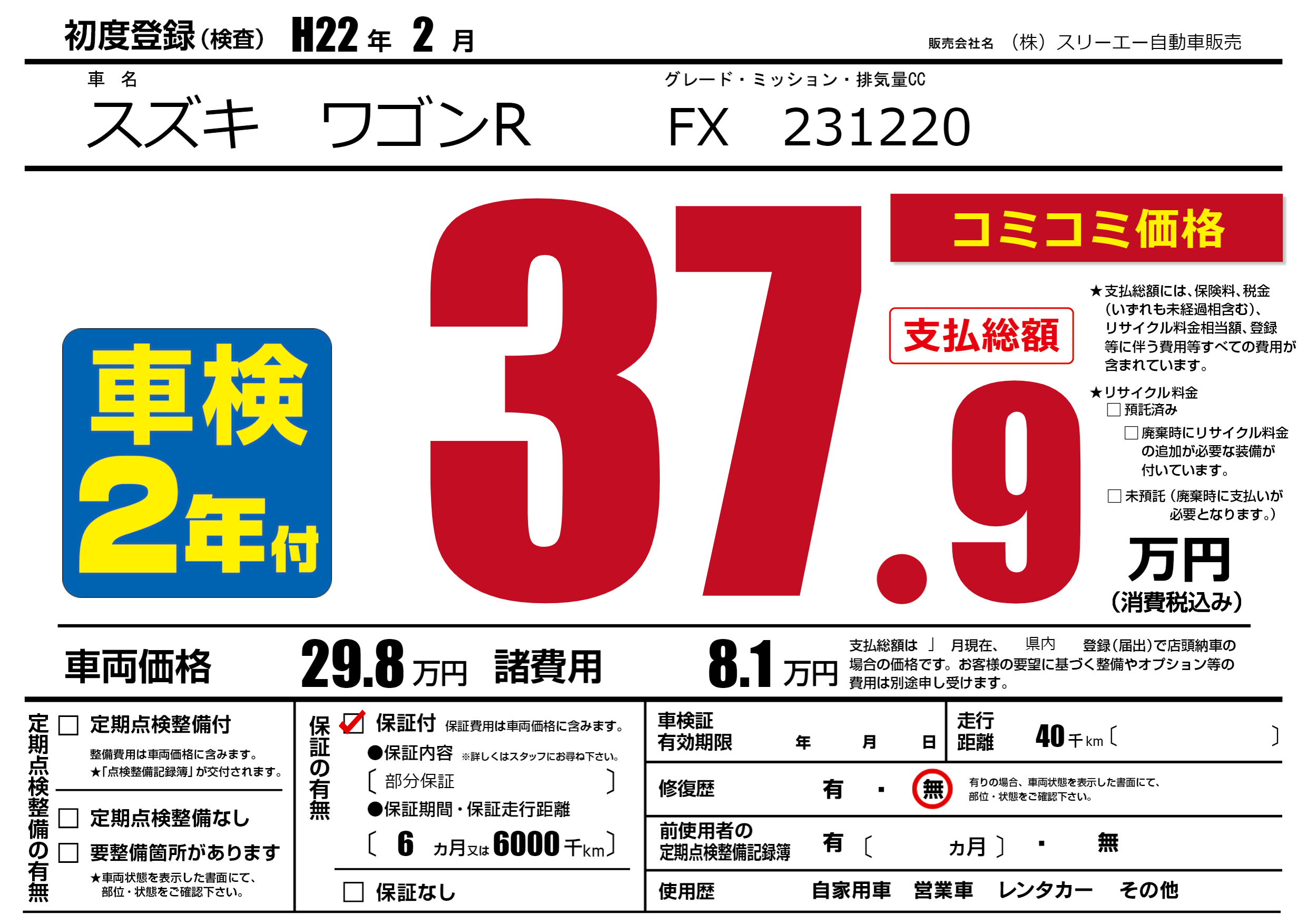 | 車名 | スズキ ワゴンR | グレード ミッション 排気量 |