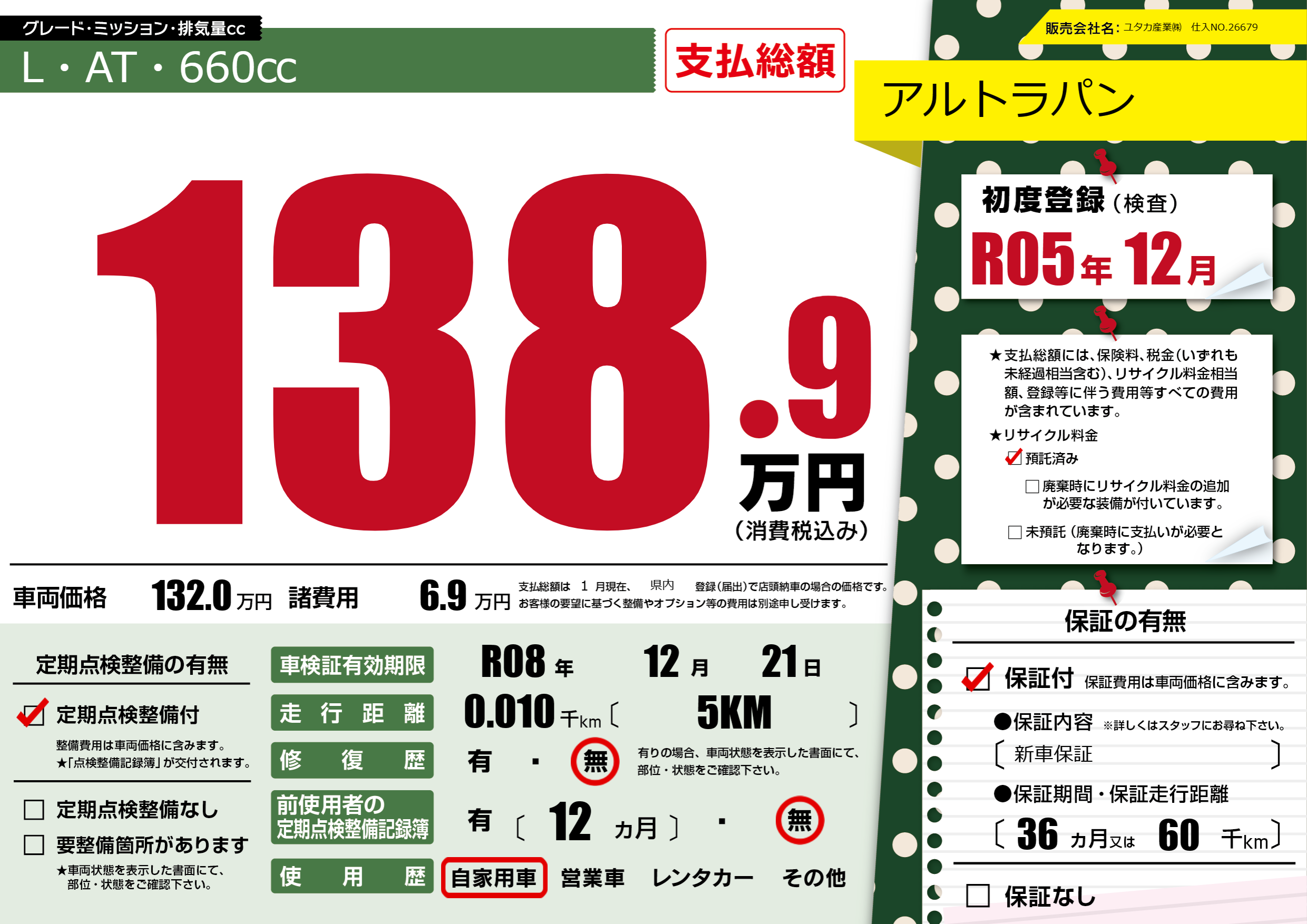 | 走行キロ | - | 初年度登録 | R05年12月 |
