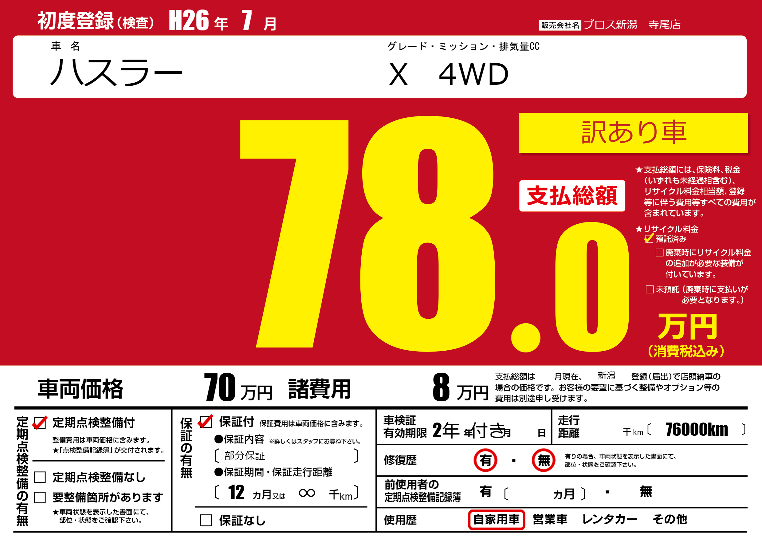 | 車名 | ハスラー | グレード ミッション 排気量 |