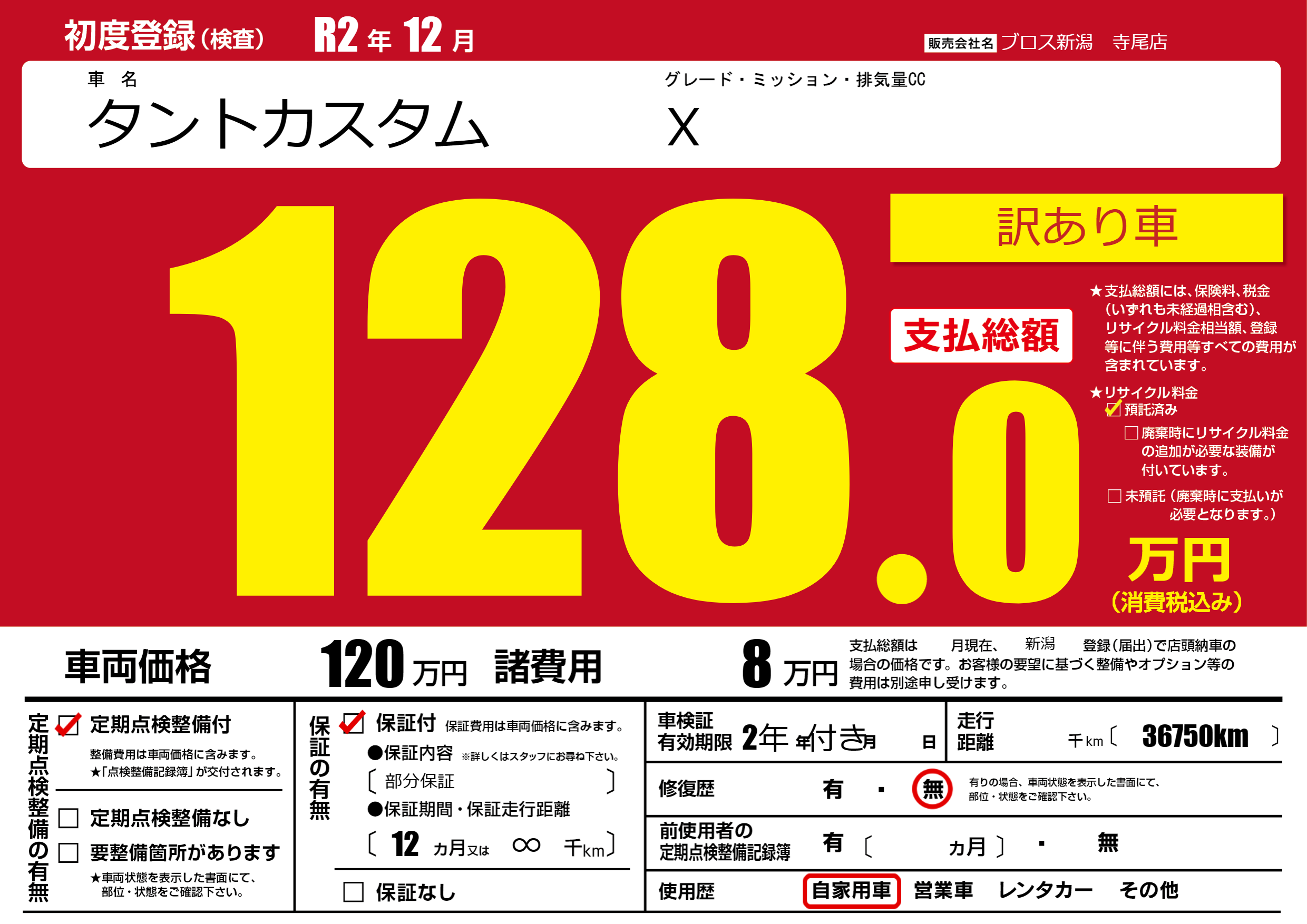 | 走行キロ | - | 初年度登録 | R2年12月 |