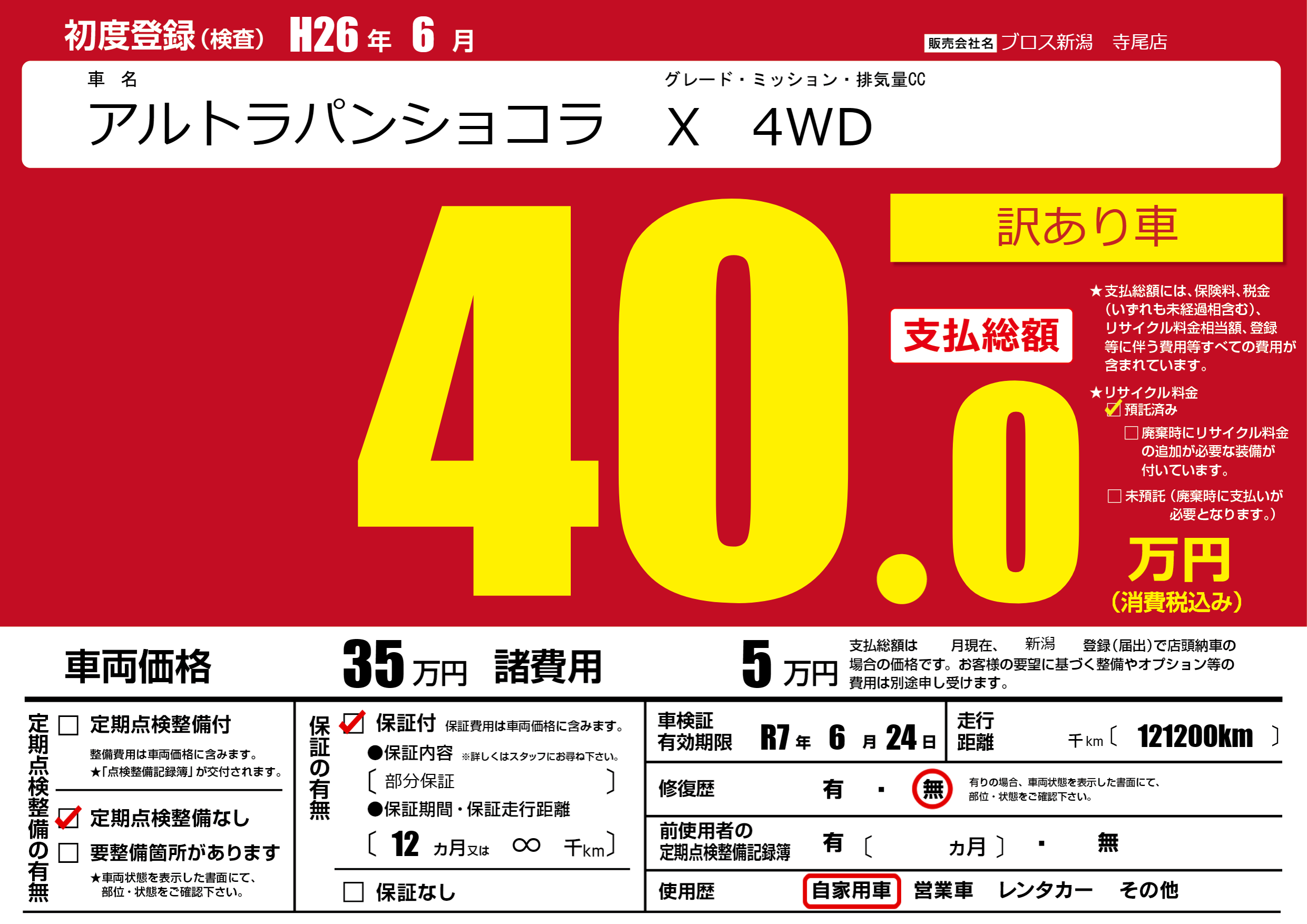 | 走行キロ | - | 初年度登録 | H26年6月 |