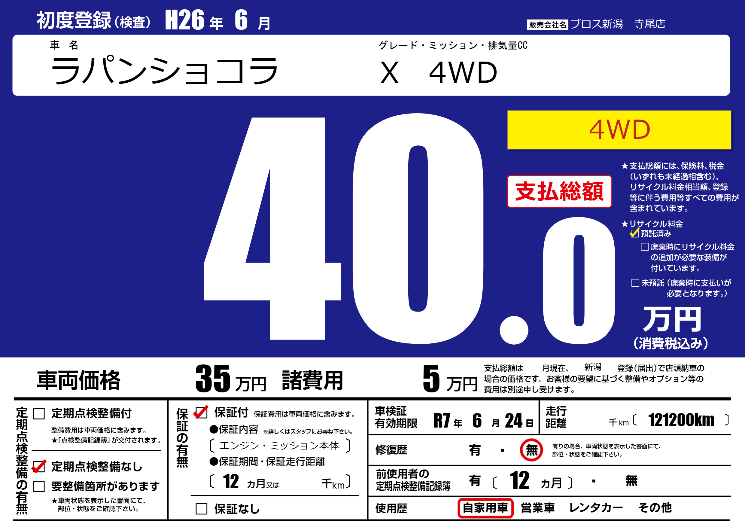 | 車名 | ラパンショコラ | グレード ミッション 排気量 |