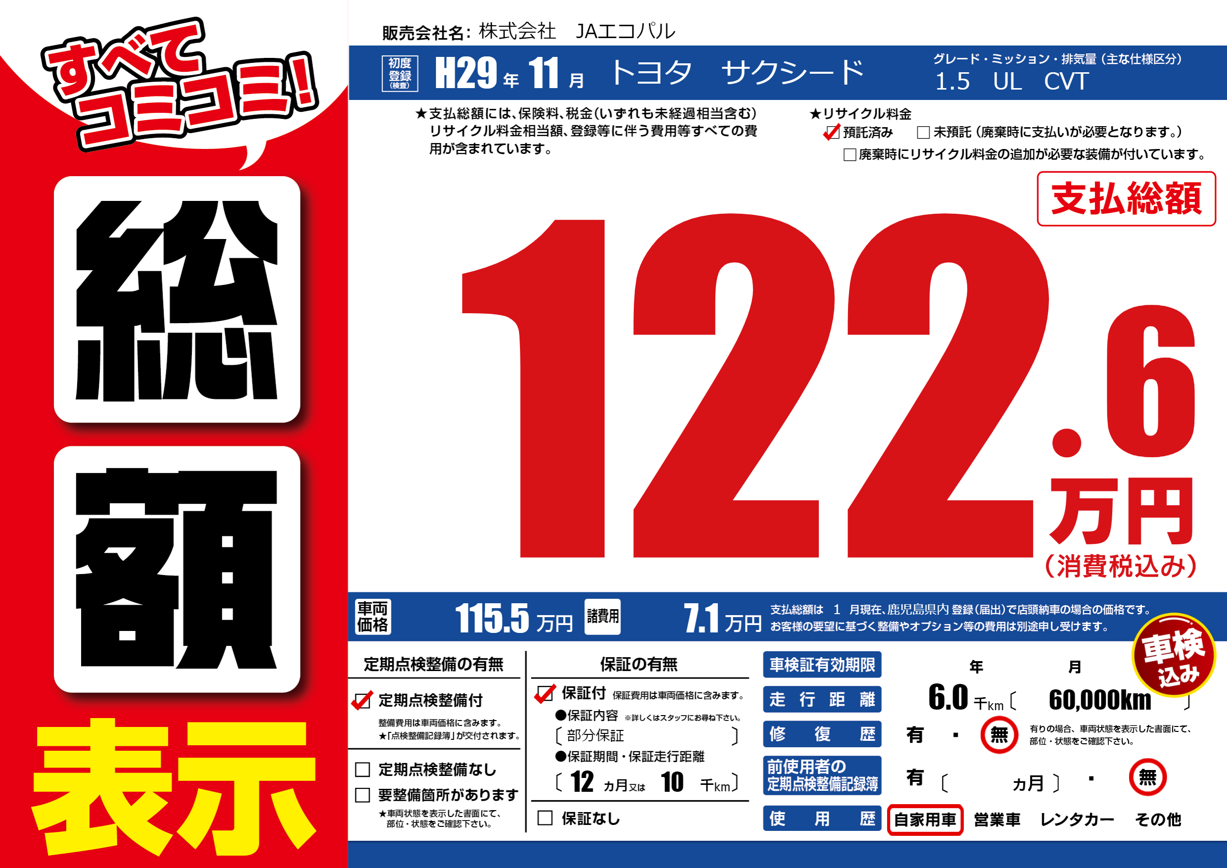 | 車名 | トヨタ サクシード | グレード ミッション 排気量 |