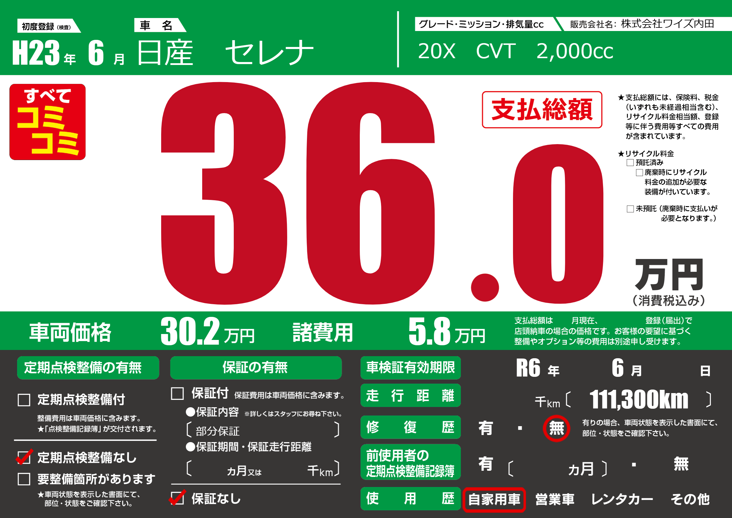 なし | 車検制限 | R6年6月---月 |
