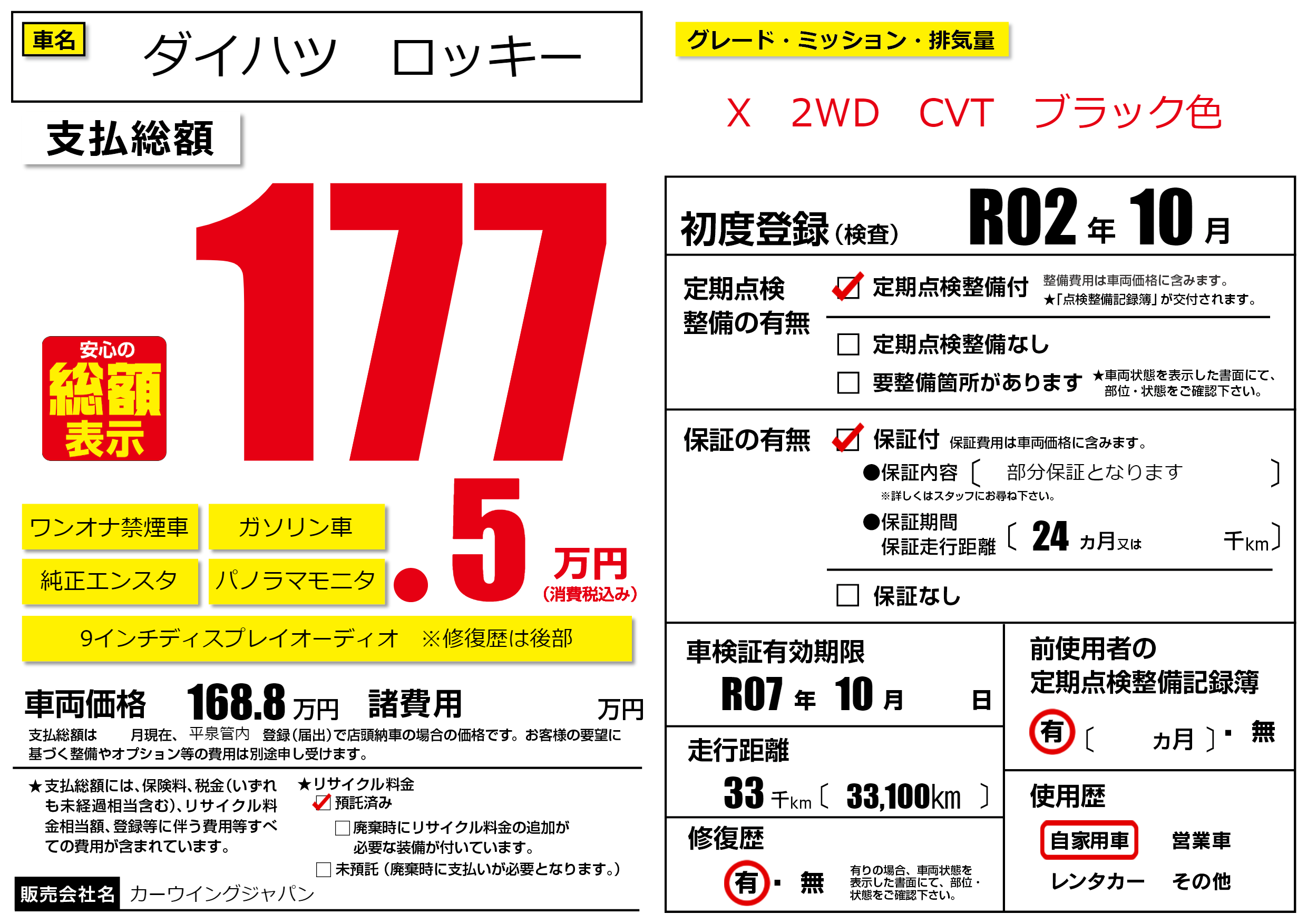 | 車名 | ダイハツ ロッキー | グレード ミッション 排気量 |