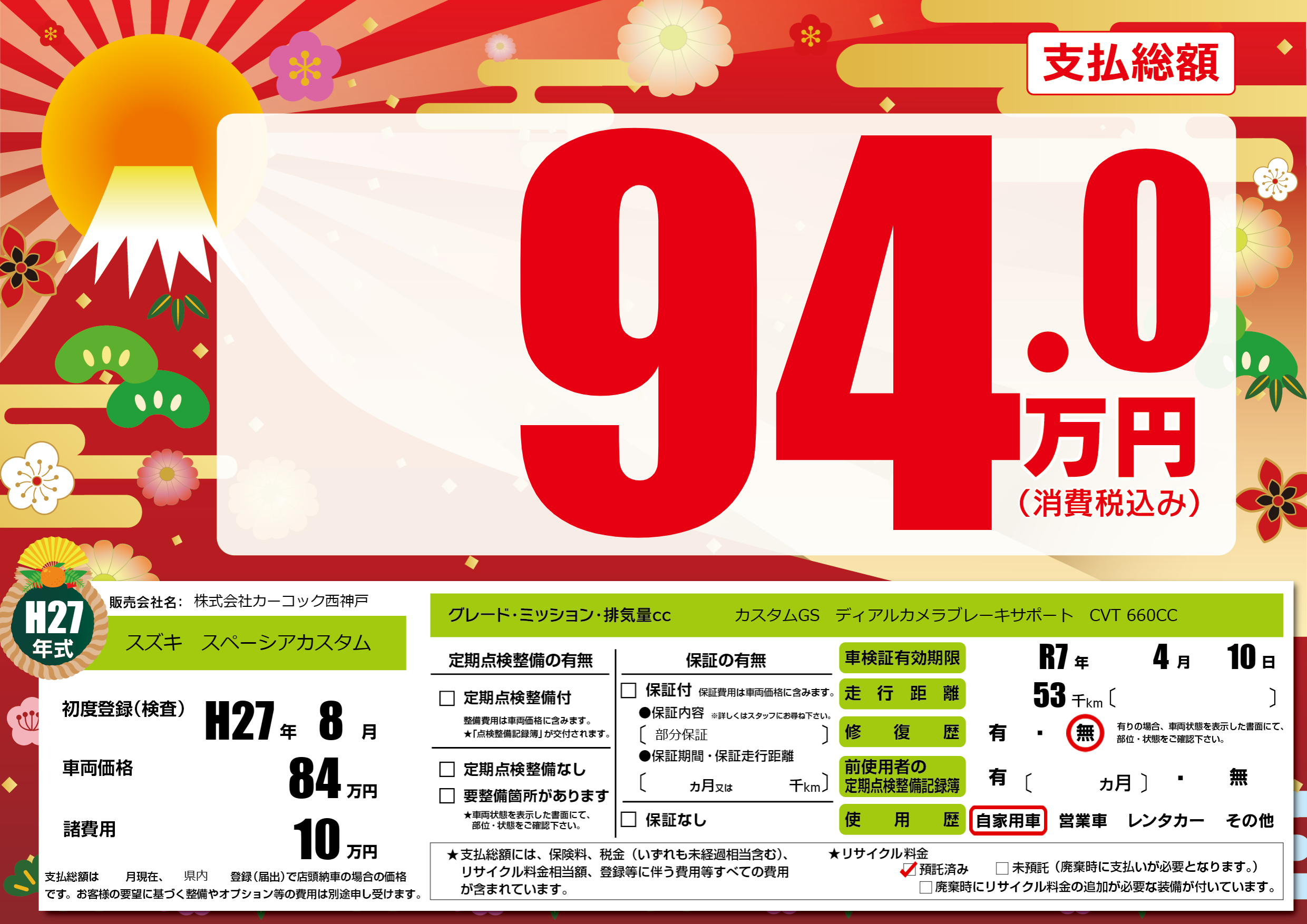 | 車名 | スズキ スペーシアカスタム | グレード ミッション 排気量 |