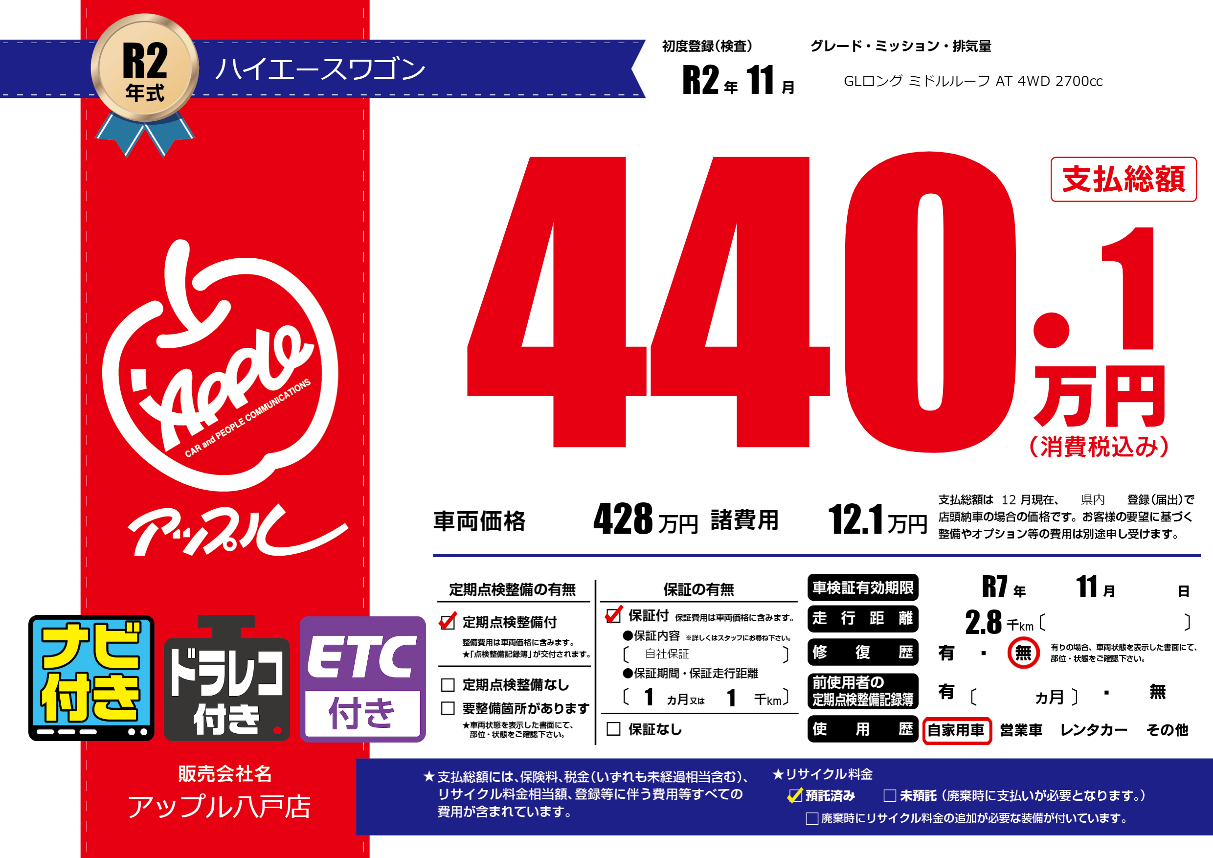 | 走行キロ | 0.2万km | 初年度登録 | R2年11月 |