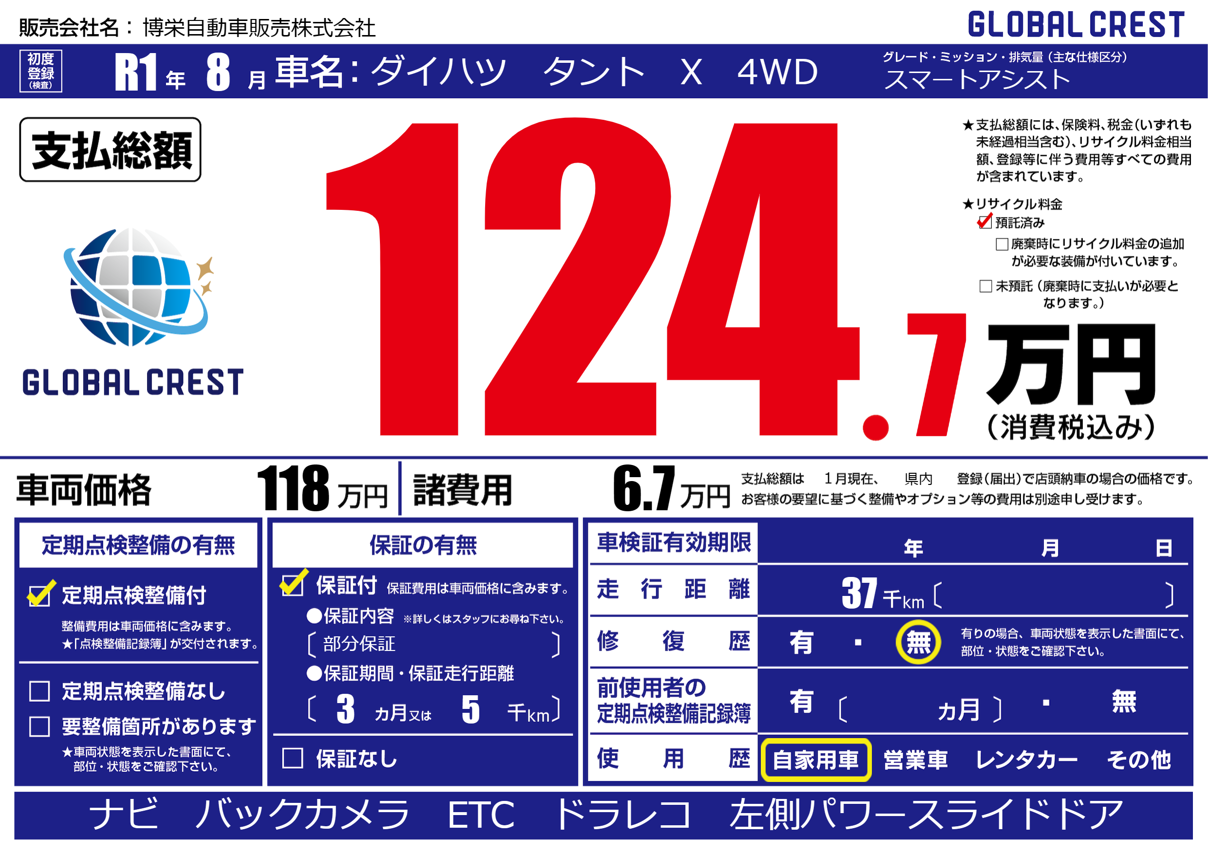 | 車名 | ダイハツ タント X 4WD | グレード ミッション 排気量 |