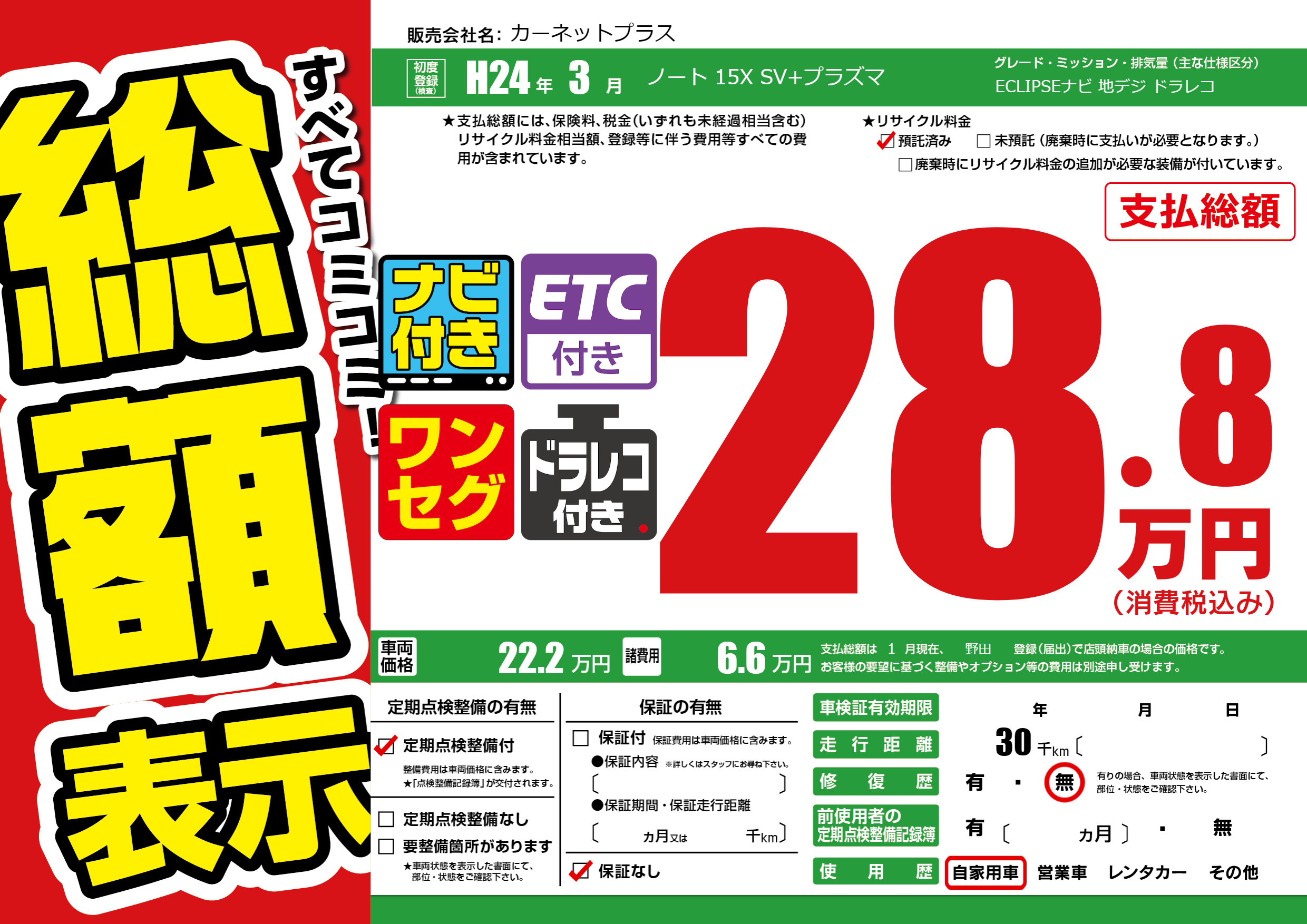 | 車名 | ノート 15X SV+プラズマ | グレード ミッション 排気量 |