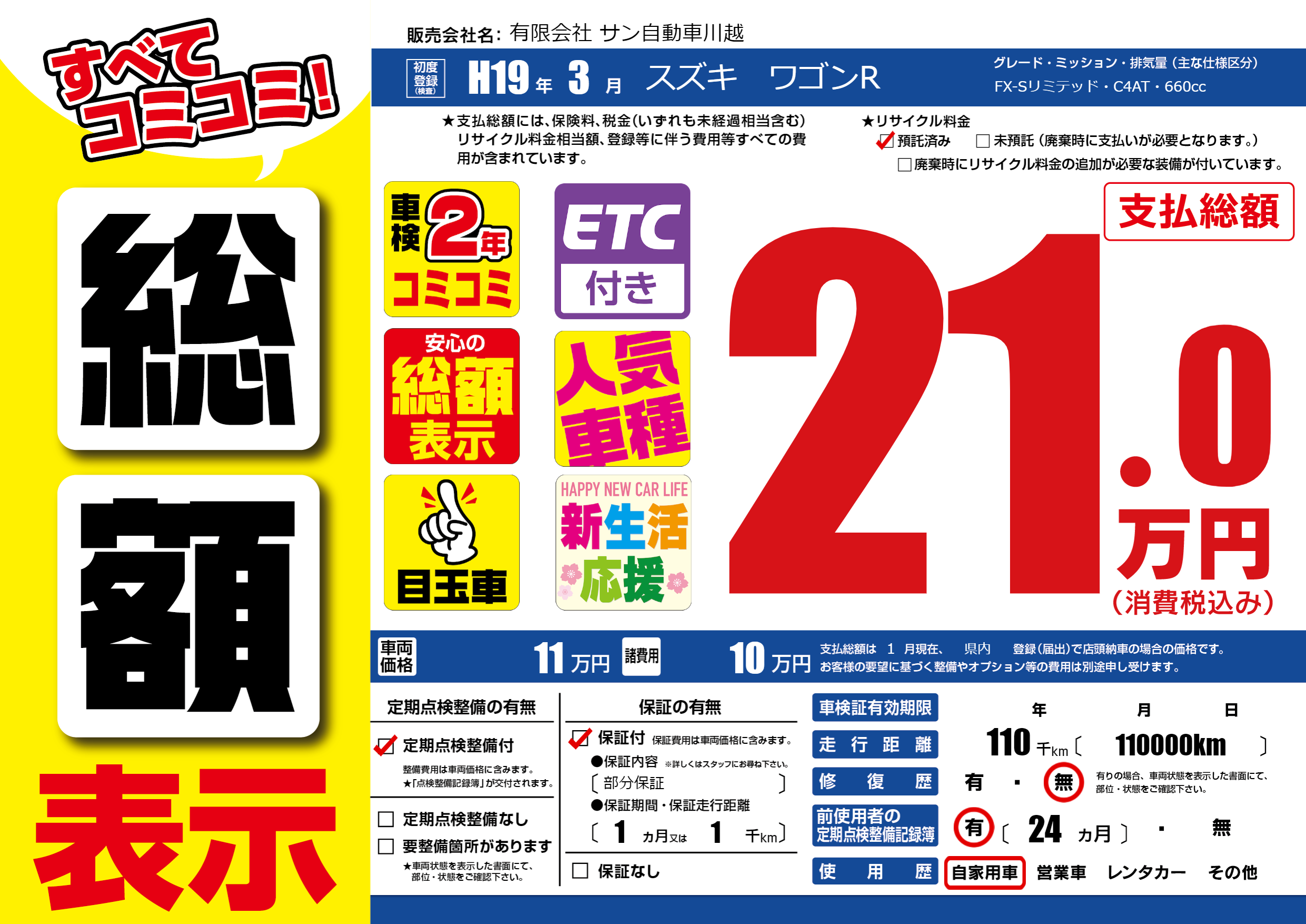 | 車名 | スズキ ワゴンR | グレード ミッション 排気量 |