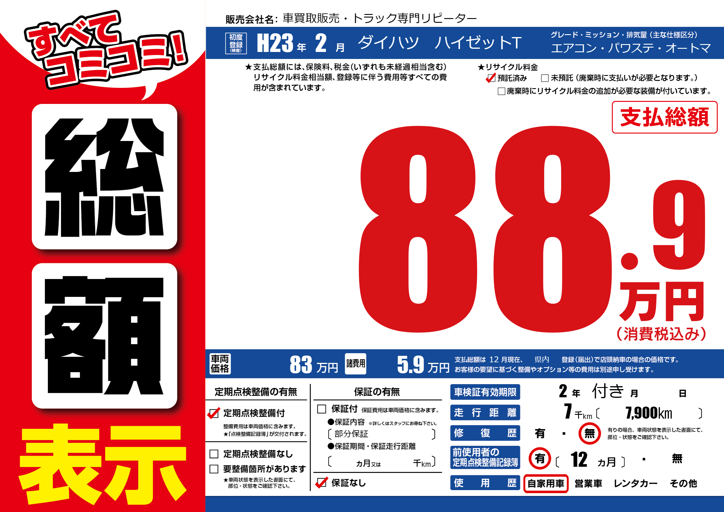 | 車名 | ダイハツ ハイゼットT | グレード ミッション 排気量 |