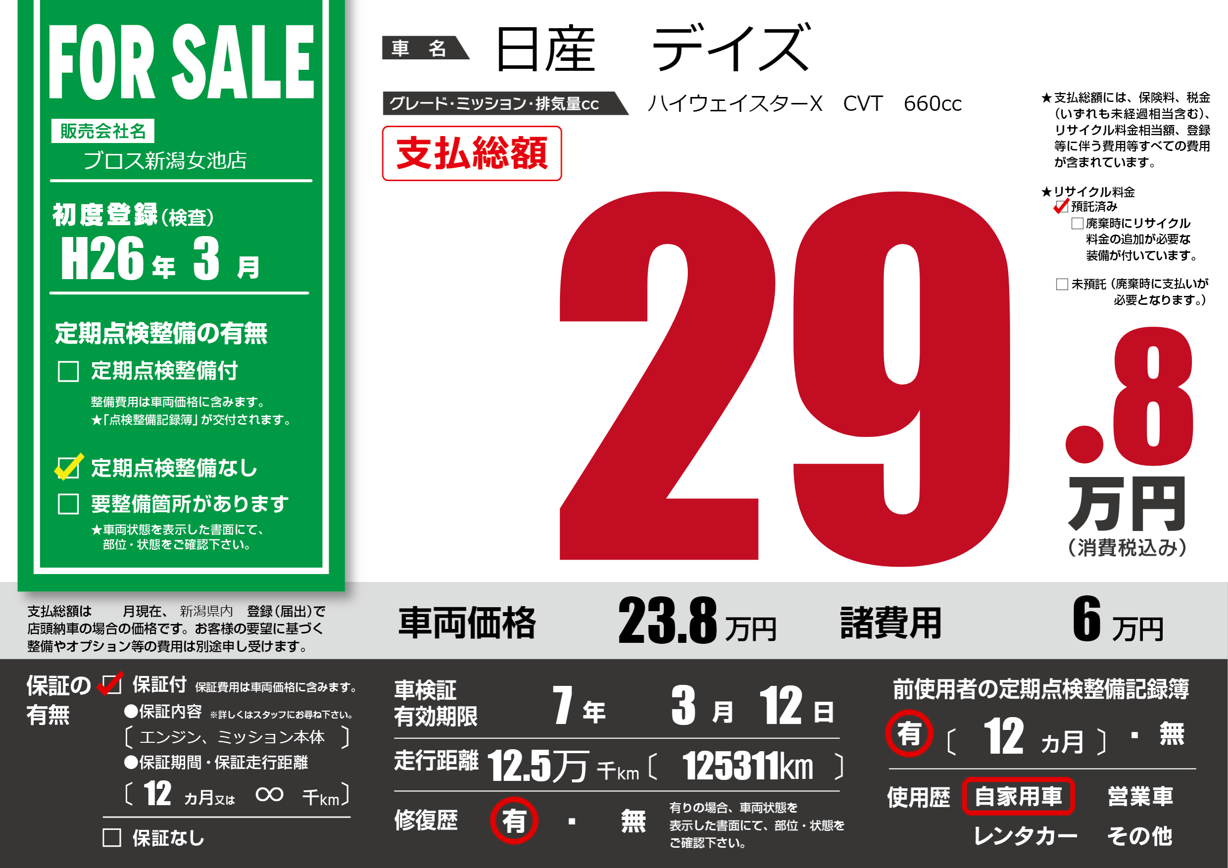 保証付き 保証内容(エンジン、ミッション本体) 12ヶ月または(∞)千kmまで |