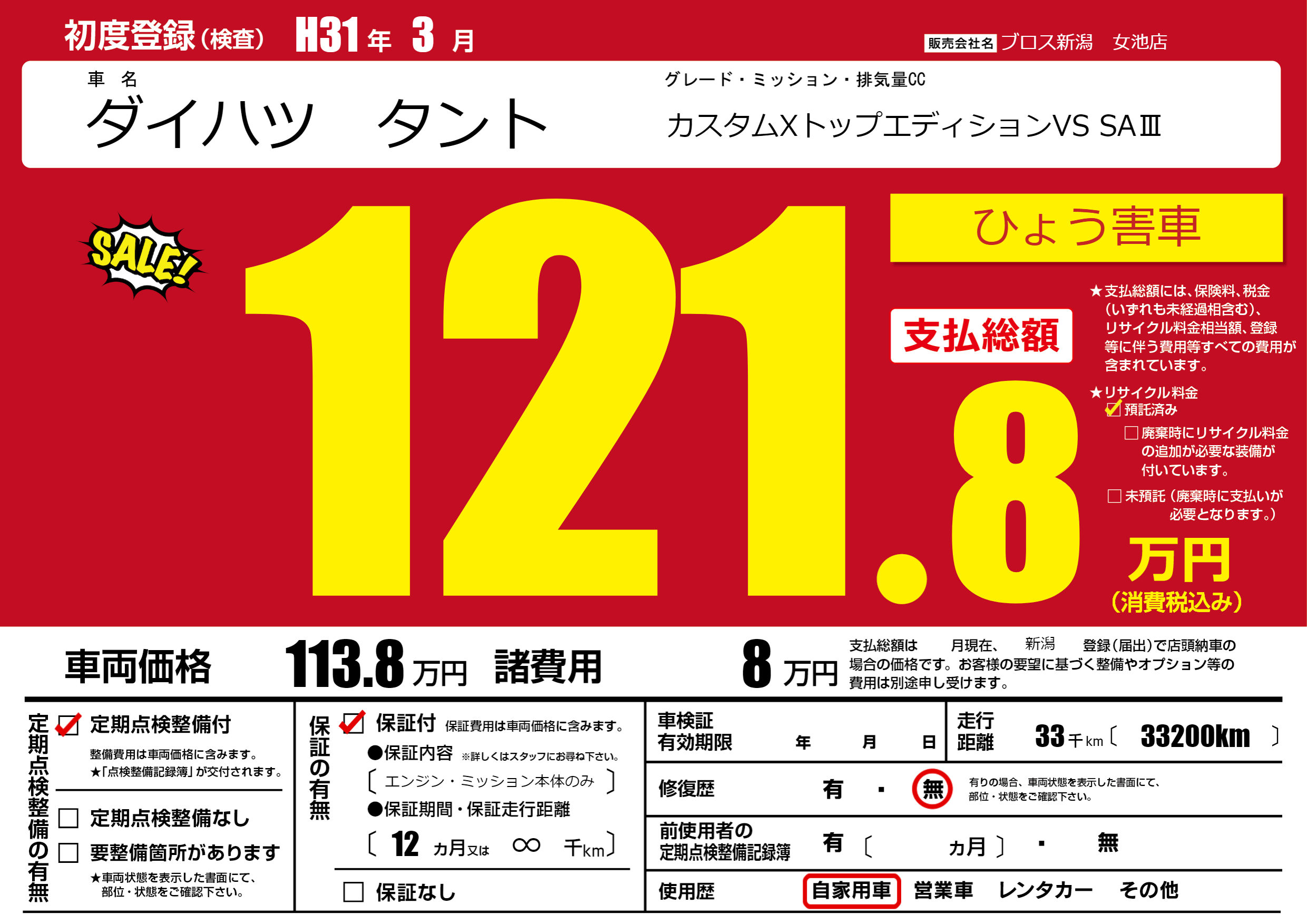 | 車名 | ダイハツ タント | グレード ミッション 排気量 |