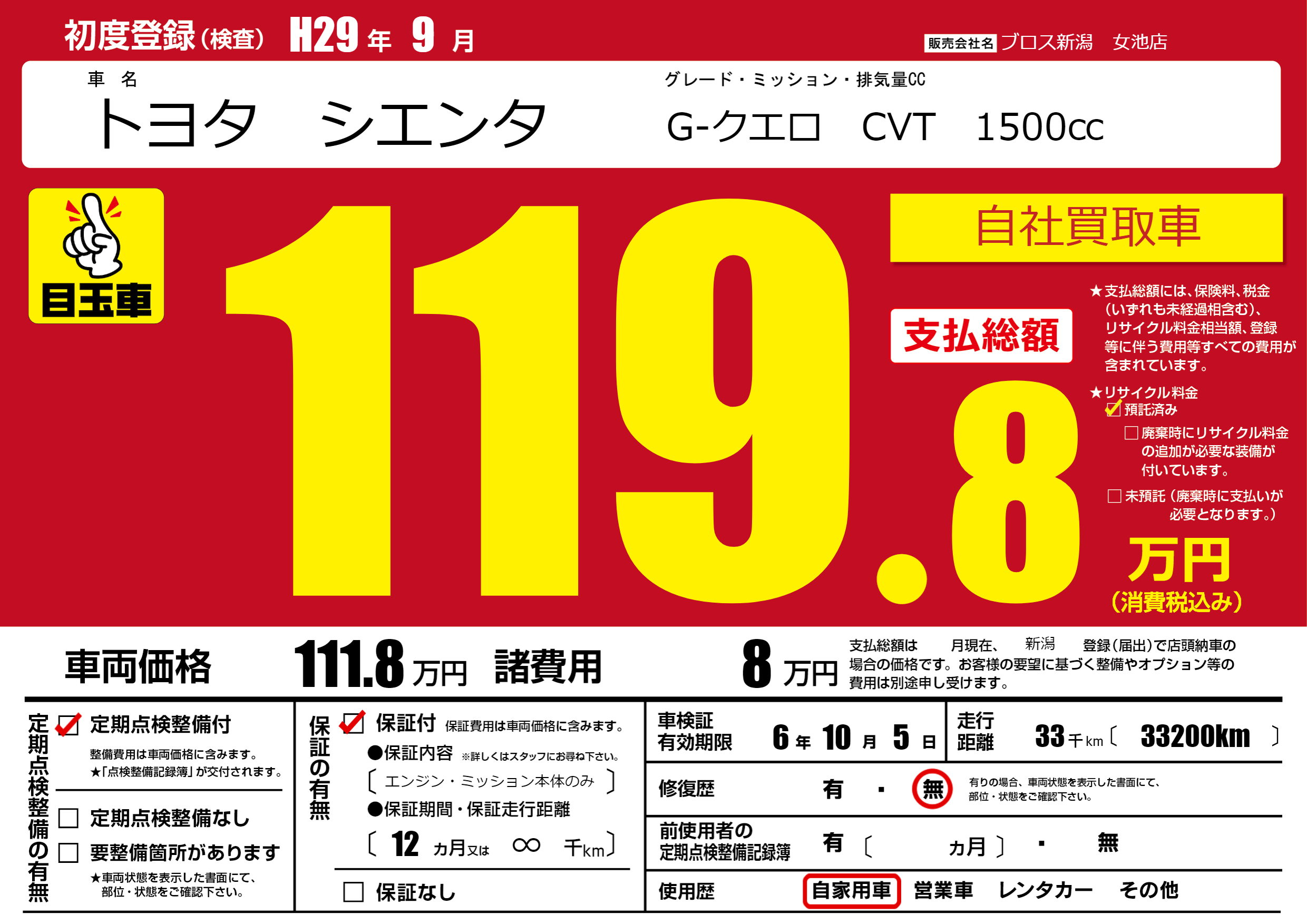 | 走行キロ | 3.3万km | 初年度登録 | H29年9月 |